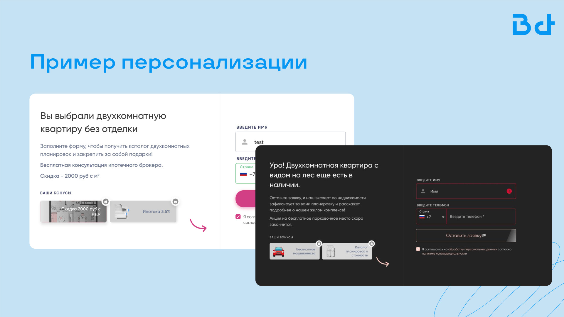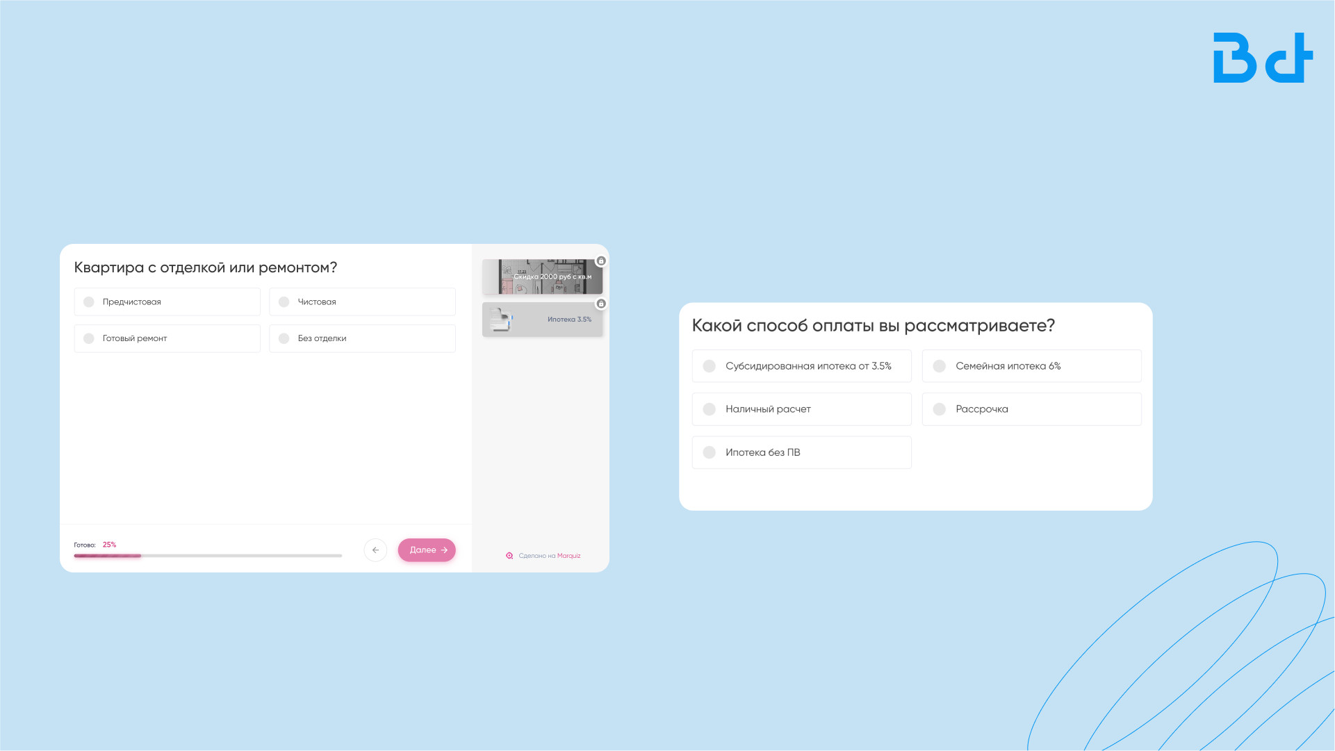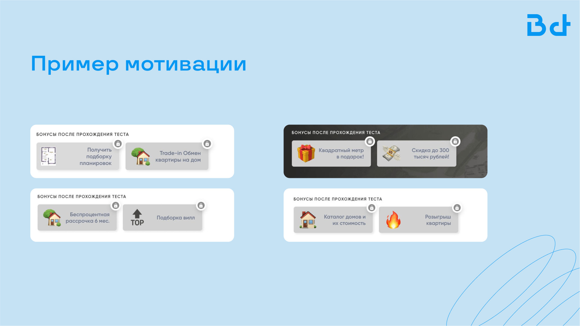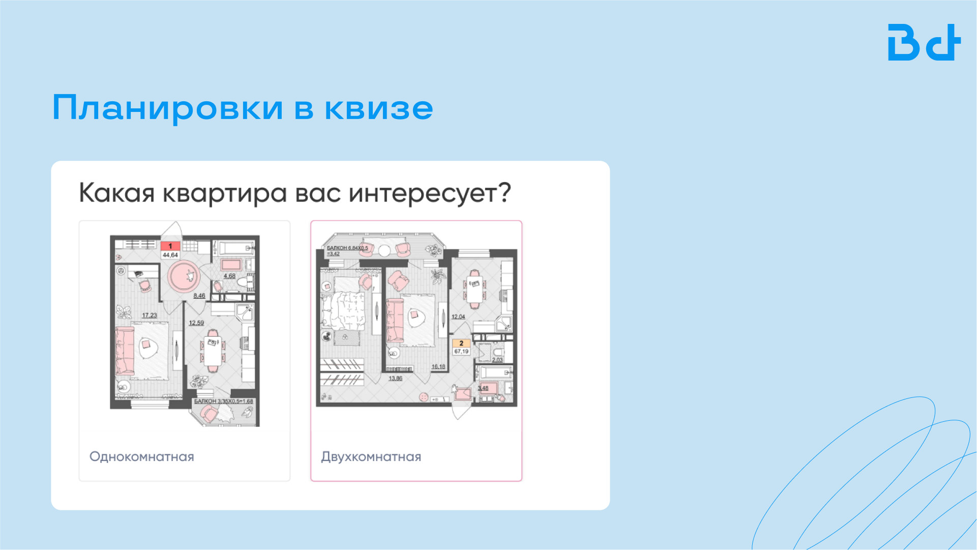 Стоимость целевого лида: 4 177 рублей Квизы — не панацея. В некоторых случаях лучше работают посадочные в виде сайтов, но в большинстве наших проектов квизы показывают себя лучше веб-страниц. Также с помощью квизов легко провести много А/В-тестов в короткие сроки. Также они стоят дешевле посадочных и их можно гораздо быстрее поправить в конструкторе при тесте новых гипотез. Если ваш сайт приносит хорошие целевые заявки — это прекрасно! Но мы все равно рекомендуем протестировать квизы, следуя рекомендациям из этого гайда. Потому что вы никогда не узнаете, в какой момент ваша привычная «золотая жила» перестанет нести целевые лиды. Иметь запасной аэропорт в виде проверенного квиза никогда не помешает. Разберем главные составляющие квиза, который приносит целевые заявки, а не сливает бюджет. На первой странице должны быть: Примеры вопросов, которые мы используем, чтобы отсеивать нецелевых клиентов и привлекать качественные заявки: Для новостроек: Для коттеджей подходят те же вопросы, кроме первого. Также добавьте: Также используйте планировки в вопросах и на креативах, чтобы наглядно показать товар, который хочет купить потенциальный клиент: Чтобы пройти квиз, человеку нужна мотивация — мини-подарок за ответ на вопросы. Что это может быть: Где указывать мотивацию? В начале прохождения квиза и в конце — когда человек уже должен оставить свои контактные данные, напомните, для чего он это делает. Выслать подарок нужно сразу же, а не после звонка менеджера. В таком случае контакт до отдела продаж дойдет уже более теплым, нежели при отправке лид-магнита во время или после звонка. Как можно оформить мотивацию: Замочки около подарка служат предметом геймификации. Человек понимает: чтобы «снять» его, он должен ответить на вопросы квиза. Обязательно добавляйте персонализацию. Это помогает показать, что вы тоже заинтересованы в том, чтобы подобрать подходящую квартиру покупателю. Такой индивидуальный подход располагает потенциальную аудиторию к застройщику или агентству недвижимости. Примеры персонализации: С помощью квизов можно протестировать множество гипотез. Причем гораздо быстрее, нежели через сайт. Примеры А/В-тестов, которые вам нужно обязательно включить: Но тестируйте по одной гипотезе за раз. Если вы внесете сразу несколько корректировок, то не сможете понять, что именно принесло целевые лиды или наоборот — растратило бюджет на показы. Мы используем для сборки квиза конструктор Marquiz (нет, это не реклама, а совет от всего сердца, поэтому маркировки не будет). Почему именно он: Но если вы используете другой конструктор, то можете поделиться в комментариях — мы с радостью протестируем его. Квиз — это интерактивная анкета для потенциальных покупателей. Чтобы сделать конверсионный квиз, нужно сочетать много разных аспектов: от визуала до персонализации. Хотите проверить свой квиз? Пройдите тест от Be digital в телеграм-канале. Тест состоит из 5 вопросов, которые помогут вам оценить, насколько ваш квиз готов к лидогенерации. Так же мы собрали для вас посты из телеграм-канала Be digital о том, какие посадочные приносят заявки: А вы пользуетесь квизами для лидогенерации? Или не верите в них?