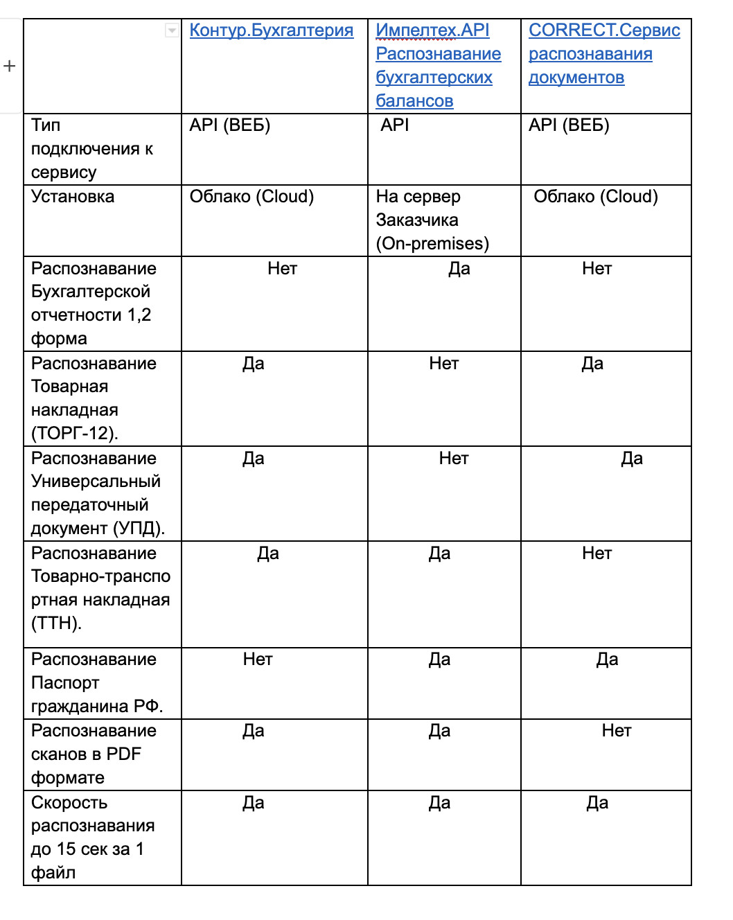 Для дальнейшего анализа необходимо составить матрицу сравнения по функциональности и способам подключения. Это позволит выбрать наилучшее решение, учитывая требования и возможности. Итак, анализ статей позволяет сделать вывод, что хотя решения от Контур и Correct обладают высокой скоростью распознавания и большим списком распознаваемых документов, они не умеют распознавать бухгалтерскую отчетность 1, 2 форму и не могут быть установлены на сервера Заказчика, что делает их непригодными для использования в банках и других участниках рынка, регулирующихся законом о банковской тайне. Однако, анализ таблицы показывает, что решения от Импелтех способны распознавать бухгалтерскую отчетность и могут быть установлены на сервера Заказчика. Это означает, что такое решение может быть использовано банками в их системах подачи заявок на кредиты или банковские гарантии, и тем самым избежать ошибок, указанных в статье. Таким образом, решения с установкой на сервера Заказчика представляют собой более привлекательный вариант для банков и других участников рынка, подчиняющихся закону о банковской тайне, благодаря своей способности распознавать бухгалтерскую отчетность и возможности установки на серверы заказчика, вероятно из за ограничения по установке сервисов распознавания в контур Заказчика, делает эту столь востребованную услугу редкой в личных кабинетах банков.