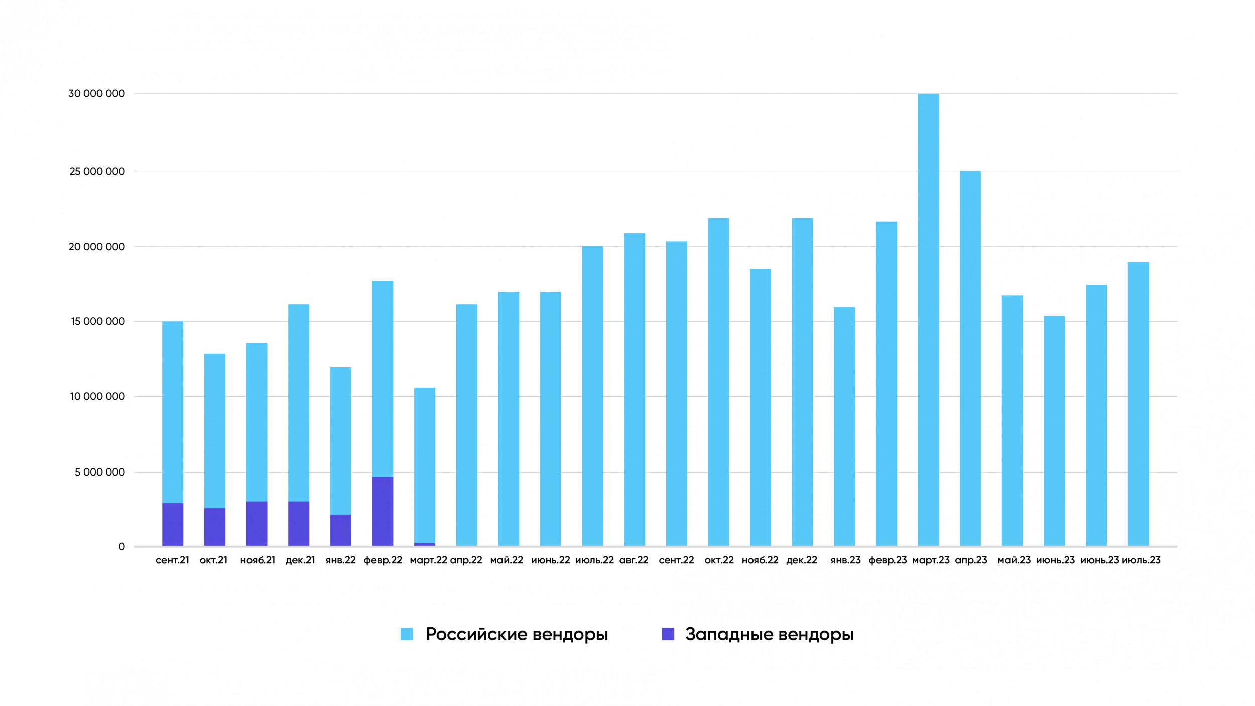 С сентября 2021 до марта 2022 года доля иностранных вендоров в общем доходе составляла, в среднем, до 25% в интеграции Adfox HB, Prebid.js, а также прямыми тегами.