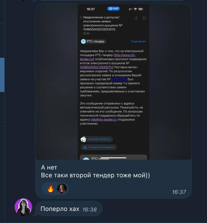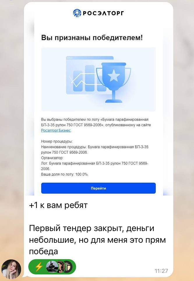 Первый тендер — всегда самый эмоциональный! Это как знак того, что ты можешь. Можешь с нуля в новой нише быстро сделать результат 🔥