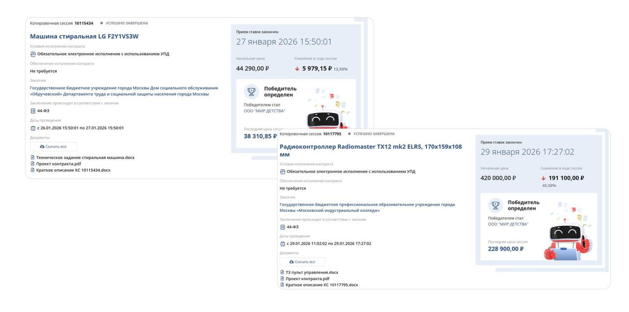Он выиграл тендер на поставку радиоконтроллеров для Московского индустриального колледжа. Начальная цена была 420к, снизили на 45,5% и забрали контракт за 228.900р