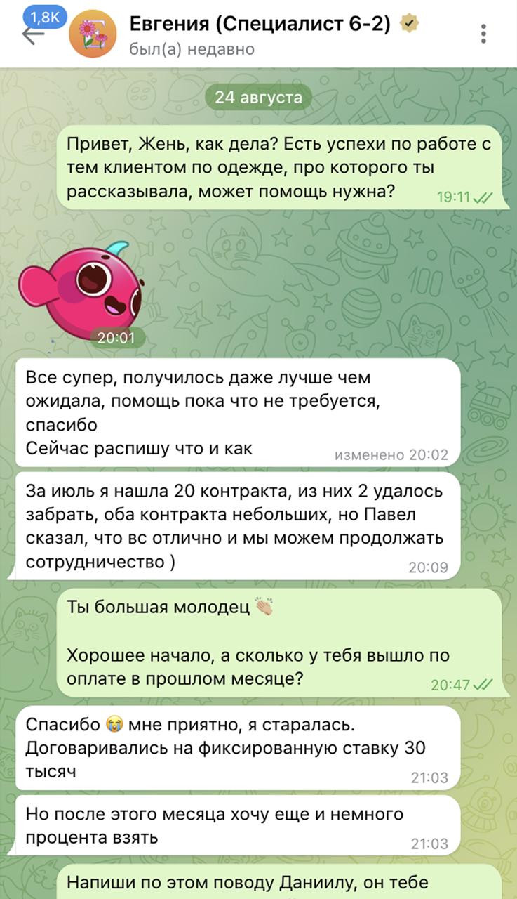Сейчас Евгения получает зп как администратор FixPrice — 35.000р. И дополнительно еще 30.000р как тендерный специалист. В сентябре к фиксированной оплате они добавляют процент (она будет получать фикс + 5% с чистой прибыли каждого тендера)