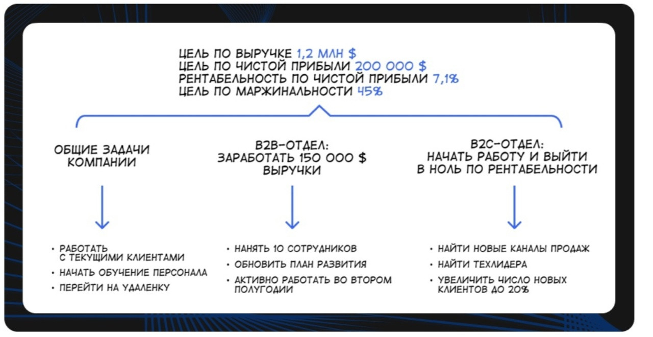 Так как стратсессия проводилась с целью планирования 2023 года, в финале мы сконцентрировались на бюджете будущего года. Его черновик был подготовлен заранее, в нем проставлены примерные суммы, что сильно упростило нашу задачу. Нам лишь нужно было совместить его с новыми идеями. Процесс шел приблизительно так: мы отметили, что планируем развивать XR-разработку. Для этого понадобятся еще 2 разработчика и руководитель отдела. Мы можем оценить это в 700 000 рублей ежемесячно, если хотим оставить маржинальность прежней. Внеся это в бюджет, мы посмотрели, будет ли это целесообразным. И такие же действия проводились с каждым новым предложением. Это был один из самых серьезных этапов нашей стратсессии. Каждая новая задача подлежала тщательному моделированию и просчету. Здесь очень важно определить, что сотрудники принимают на себя ответственность за озвученные цифры, станут ориентироваться на них и достигать их. Если бы компания не ставила бюджет в цели стратсессии, мы бы сформировали новые сценарии развития на базе финмодели. В этом случае у нас бы фигурировали целевые показатели по выручке, прибыли и рентабельности. Так как стратсессия проводилась с целью планирования 2023 года, в финале мы сконцентрировались на бюджете будущего года. Его черновик был подготовлен заранее, в нем проставлены примерные суммы, что сильно упростило нашу задачу. Нам лишь нужно было совместить его с новыми идеями. Процесс шел приблизительно так: мы отметили, что планируем развивать XR-разработку. Для этого понадобятся еще 2 разработчика и руководитель отдела. Мы можем оценить это в 700 000 рублей ежемесячно, если хотим оставить маржинальность прежней. Внеся это в бюджет, мы посмотрели, будет ли это целесообразным. И такие же действия проводились с каждым новым предложением. Это был один из самых серьезных этапов нашей стратсессии. Каждая новая задача подлежала тщательному моделированию и просчету. Здесь очень важно определить, что сотрудники принимают на себя ответственность за озвученные цифры, станут ориентироваться на них и достигать их. Если бы компания не ставила бюджет в цели стратсессии, мы бы сформировали новые сценарии развития на базе финмодели. В этом случае у нас бы фигурировали целевые показатели по выручке, прибыли и рентабельности.