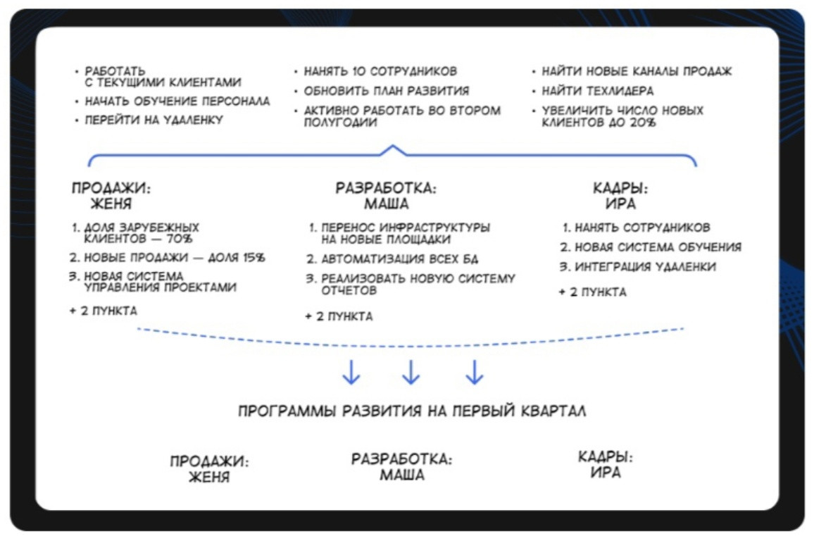 Затем среди всех задач были выделены те, которые относятся к каждому конкретному отделу. Их поручили соответствующим руководителям. По 5 ключевых задач на отдел. И на основе этого определили планы развития каждого отдела на первый квартал. Программу развития, которая получилась в итоге, мы презентовали прямо на стратегической сессии. В конце встречи команда согласовала и утвердила план действий и бюджет. Оставалась самая активная и интересная часть: старт программ и контроль за их реализацией.