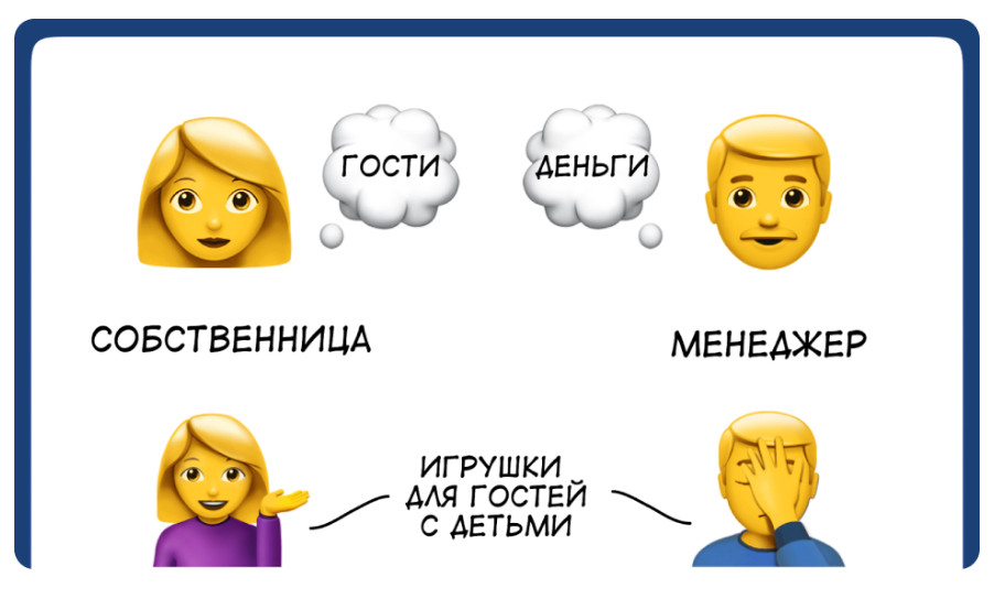 Предположим, у нас есть хозяйка сети ресторанов — Вера. Для неё важно, что основной упор в бизнесе делается на развлечение гостей. Вера считает, что приобретение дополнительных игрушек для детского уголка в ресторане повысит удовлетворенность гостей с детьми. Сомнительно, что наша владелица станет нанимать менеджера, для которого пазлы и куклы в ресторане — напрасные затраты