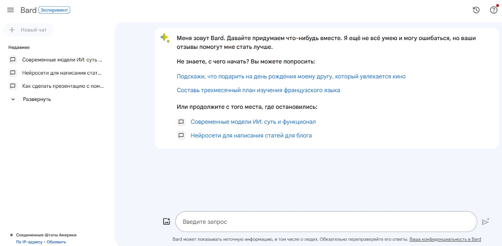 - Bard — чат-бот от Google, который умеет генерировать текст различных стилей, включая стихи, код, сценарии, музыкальные произведения, электронные письма, письма и т. д. Основой ее работы является модель LaMDA, которая обучается на доступных публичных наборах данных. В отличие от своего конкурента GPT-4, Google Bard имеет более узкую направленность, поэтому не всегда может ответить на вопросы. В России доступен через VPN.