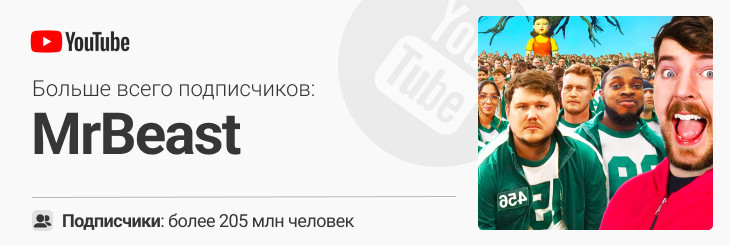 Среди блогеров-людей больше подписчиков в YouTube у американца MrBeast, на которого подписано более 205 млн человек.