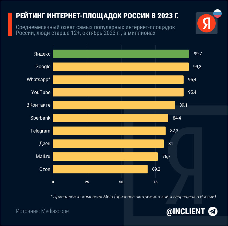 - Ежемесячный охват Яндекса в России составляет 99.78 млн пользователей
