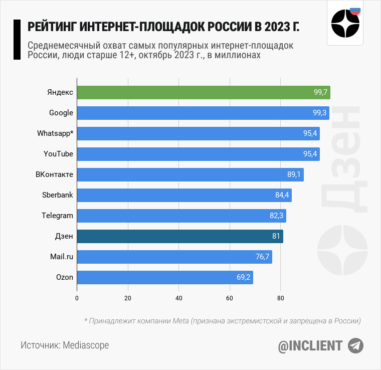В 2023 году блог-платформа Дзен занимает 8-е место среди топовых интернет-площадок в России. Вот главная статистика Дзена в 2023 году:
