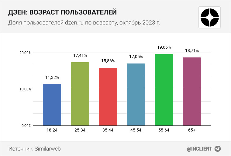 - Большинство пользователей Дзена это люди в возрасте от 55 до 64 лет
