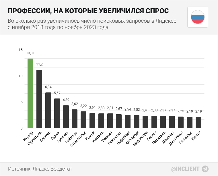 Количество запросов как стать курьером выросло более чем в 13 раз за последние пять лет. На втором месте по числу запросов — как стать строителем (рост в 11 раз), третье место — как стать блоггером (рост почти в 7 раз). В ноябре 2023 года в Яндексе наблюдался особенно высокий спрос на профессию Строитель и Судья — число запросов по ним увеличилось в среднем более чем в 5 раз. Источник: Яндекс Вордстат. Оригинал статьи — https://inclient.ru/professions-russia-2023-statistics/ * * * Подпишитесь на мой телеграмм-канал Бегин про блоги, где я делюсь своими исследованиями или читайте статистику соцмедиа (есть данные по России).