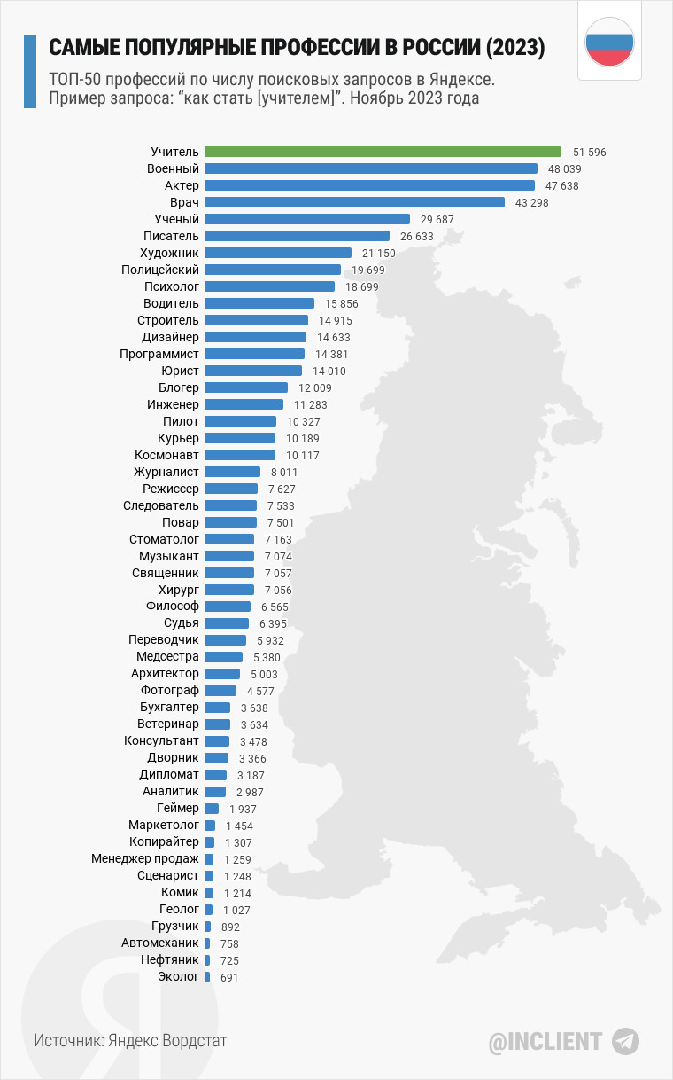 Согласно статистике Вордстата самой популярной профессией в России является Учитель (51.6 тысяч поисковых запросов в Яндексе). Второе место — Военный (48 тыс.), на третьем месте Актер (47.6 тыс.).