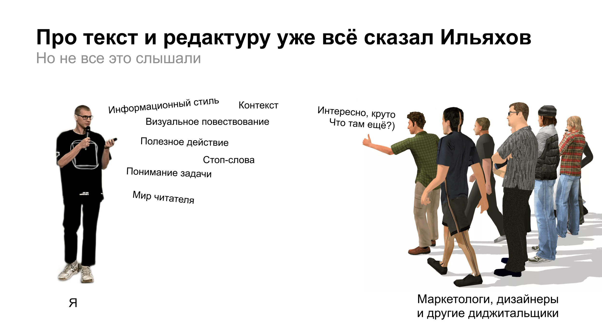 Мне казалось, что моя целевая аудитория — это мои коллеги, другие копирайтеры и редакторы. Поэтому, что я могу сказать им такого, чего они ещё не знают? Мы ведь все учились по одним и тем же книгам: «Пиши, сокращай» и «Ясно, понятно». Или проходили курсы, где учат тому же, о чём написано в этих книгах.