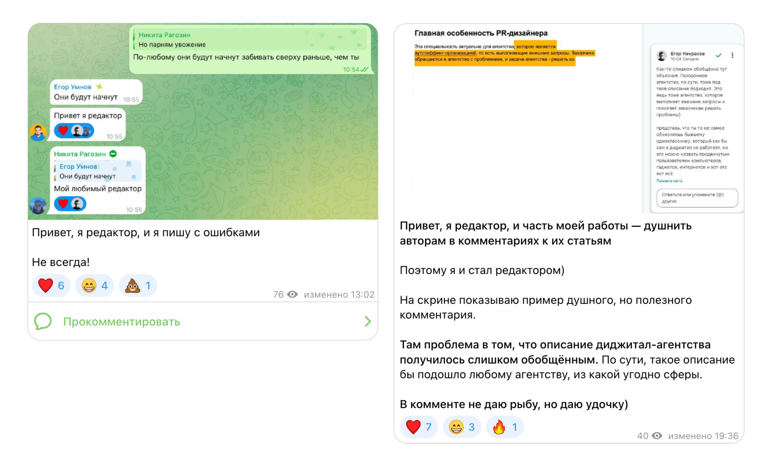 Плюс, среди редакторов и копирайтеров есть новички, для которых мой опыт тоже окажется полезным. Раньше я думал, что профессиональный блог обязательно должен быть серьёзным. Каждый пост должен нести пользу и быть похож на мини-урок. Например, как на каналах у Максима Ильяхова. У него нет личного контента, в каждом посте он чему-то нас учит. Не утверждаю, что каналы, где только полезный контент, плохие. Но лично мне такой подход не очень нравится. Сам по себе замечаю, что подобные каналы читаю не часто, примерно пару раз в неделю. Как избавился от заблуждения. Опять же, помогли наблюдения за тг-каналами коллег. Их я читаю регулярно и сразу, как выходят посты. При этом прям полезных постов у них выходит не особо много. Больше они пишут просто про какие-то ситуации на работе. И, оказалось, что это интересно. Я понял, что мой контент может быть на стыке редактуры, работы в агентстве и жизни в целом. Я могу писать не просто сухие мини-уроки по редактуре, а истории, которые связаны с моей профессией и рабочими ситуациями. Например, выпустили статью — можно написать о том, как над ней работал. Или, если на работе произошёл какой-то кек, его тоже будет уместно закинуть в канал. Контент с личными историями будет интереснее читать и в нём будет проглядываться индивидуальность автора. Люди будут видеть не просто очередного безликого эксперта, а живого человека со своими взглядами и ценностями. Это поможет собрать вокруг себя лояльную аудиторию. Имеется в виду, что не поможет с точки зрения дохода. Мне казалось, что личный бренд не может помочь штатному сотруднику увеличить свою стоимость. Потому что доход сотрудника определяется по опыту в резюме, а не по количеству подписчиков. Я думал, что зарабатывать на личном бренде можно двумя способами: Как избавился от заблуждения. Увидел, что другие ребята неплохо зарабатывают на рекламе в личных каналах. Например, основатель контент-агентства «Сделаем» Паша Молянов в подкасте рассказал, что, когда у него было 15к подписчиков, он зарабатывал полмиллиона рублей в месяц на рекламе. Сейчас у него больше 17к подписчиков, а доход — 700к рублей. Влад Савин, экс управляющий партнёр дизайн-студии MAX, у себя в тг-канале рассказал, что получает 200к рублей в месяч за рекламу при 6к подписчиков. Думаю, что уже при тысяче подписчиков можно получать небольшой дополнительный доход с рекламы. Кроме того, я понял, что могу брать заказы не на написание статей, а на разборы. Так мне не придётся что-то самому писать и тратить на это по несколько часов. Разбор можно будет провести в формате созвона. Что для меня будет и быстрее, и легче. В заключительном блоке было бы логично написать список причин, почему всё-таки стоит начать развивать личный бренд. Типа так: «Я начал вести свой тг-канал и вы начинайте. Вот вам список причин, почему это полезно...» Но не буду так делать, потому что не хочу никого ни в чём переубеждать. Если вам кажется, что личный бренд переоценён, — окей, значит для вас это правда так. А если вы всё-таки хотите начать развивать личный бренд, но вас что-то тормозит, надеюсь, мой опыт будет полезен, и вы заведёте тг-канал или что-то другое. Подписывайтесь на мой тг-канал, если вам интересна работа с контентом, в том числе для личного блога.