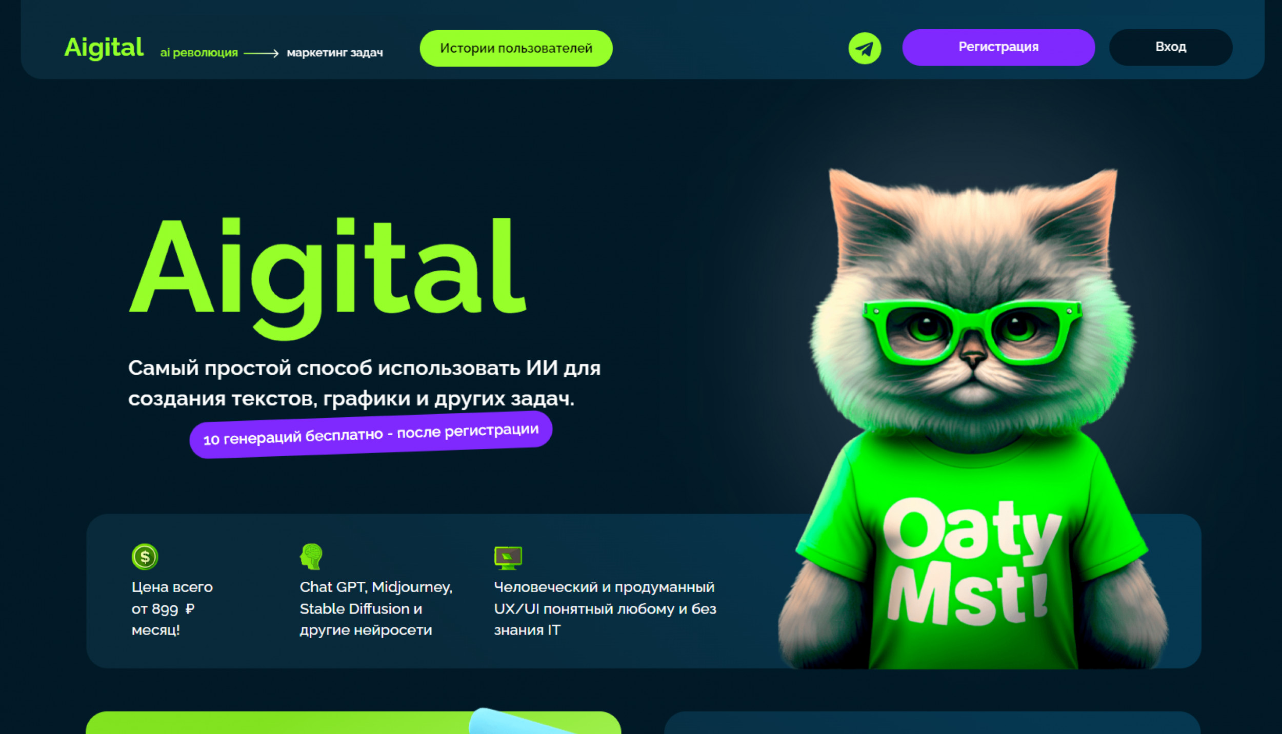 Проект, про который сегодня пойдёт речь — сервис на нейросетях для создания текстов, графики и другого контента для маркетинговых задач под названием Aigital. Сервис облегчает использование искусственного интеллекта для предпринимателей и специалистов в различных сферах.