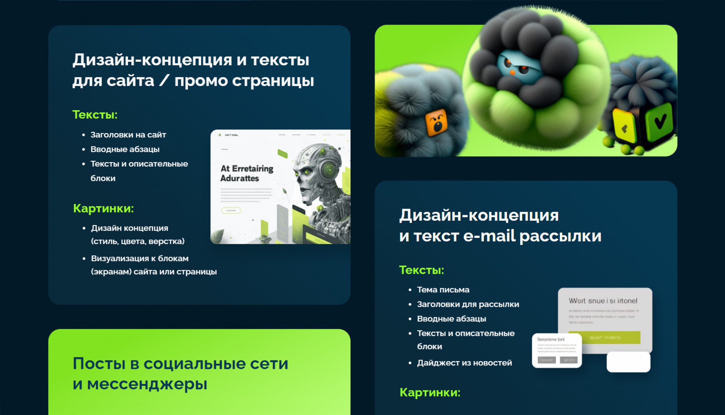 Любой проект начинается с первичного брифа, после которого на созвоне детально обсуждаются все нюансы с заказчиком. Собирается вся информация о задаче, бизнесе и его клиентах. После чего с помощью текста и дизайна отражаются ценности, выстраивается пользовательский путь, который приводит пользователей к целевому действию. Здесь же часть продумала нейросеть.