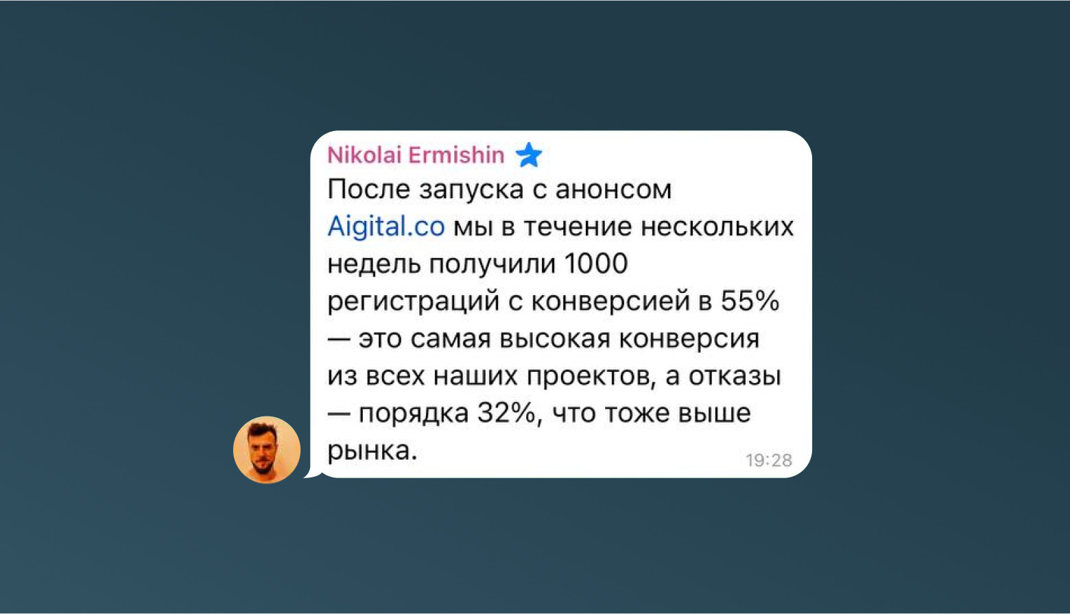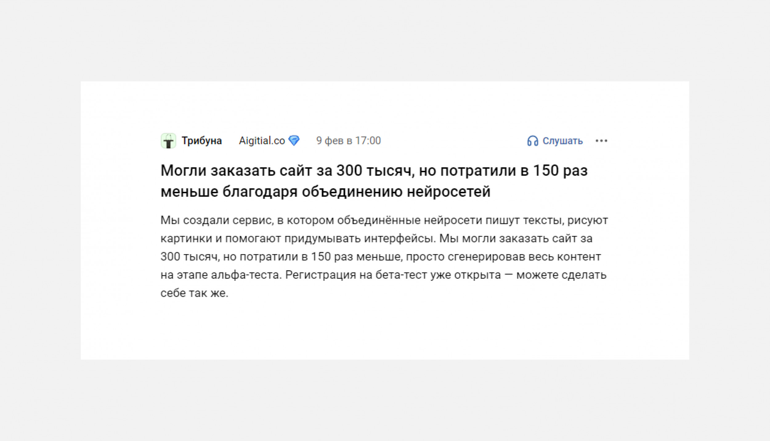 Тут можно заволноваться и вспомнить про тему, что нейросети всех нас заменят. В данном случае ИИ выступил копирайтером, дизайнером, иллюстратором и создал структуру посадки. Проблем в процессе не возникло. Была сделана более понятная вёрстка текста и добавились плашки для удобства восприятия контента пользователем. Получилось уложиться за один день, а потом внесли минимальные правки — сделать цвета ярче. Лендинг быстро запилили и запустили, а команда Aigital пошла раскручивать свой продукт на vc. Кейс прочитали свыше 30 тысяч человек. По словам клиента, сайт получился сверхконверсионным. С одного материала они получили более тысячи заявок и открыли сервис даже раньше, чем планировали, потому что увидели спрос. Хороший кейс плюс отличный лендинг сделали своё дело. Статья привлекла трафик на сайт, а он, в свою очередь, сконвертировал практически каждого второго посетителя. По словам клиента, конверсия сайта — 55%. Это самая высокая конверсия из всех их проектов. Отказы — порядка 32%, что тоже выше рынка, но эти данные не всегда релевантны. Время, проведённое на сайте — 59 секунд. В данном случае связка нейросеть и веб-студия сработали идеально. Но насколько комфортно дизайнерам работать в таком формате? Кто-то считает, что редактировать и дорабатывать проще, чем делать с нуля. Кстати, а вы как считаете? По нашему опыту, когда команда разрабатывает проект не с нуля, может возникнуть множество трудностей. Студия, которая берётся за чужую работу, может не иметь полного понимания и контекста, в котором были созданы первоначальные концепты. Она же не участвовала в разработке до этого и подхватывает проект уже на каком-то этапе. Со стороны заказчика кажется, что «там чуть-чуть докрутить», а на самом деле новой команде могут быть непонятны те или иные решения, и объём работы намного больше. В этом проекте ситуация иная. Здесь практически не нужно было работать с дизайном и прошлой командой, ведь ей была нейронка. То есть оставалось больше реализации технической части разработки. Нейросети помогают сэкономить время и деньги, но без опытных специалистов прийти к крутому результату нейросеть самостоятельно не может. А мы можем взять на себя любую задачку. Нужно сделать с нуля и продумать всю стратегию? Конечно! Доработать текущий сайт, чтобы он приносил больше лидов? Не вопрос. Взять исходники и наработки, перенести их на Тильду и докрутить? Да, пожалуйста! И при этом мы ещё скажем, где и как лучше сделать и что нужно поправить, чтобы точно сработало. И можно проверить это прямо сейчас бесплатно. Отправьте нам свой сайт (или скелет сайта), мы проведём аудит и поймём, что можно докрутить для повышения конверсии. Может ваш сайт — следующий сверхконверсионный результат в нашем портфолио.