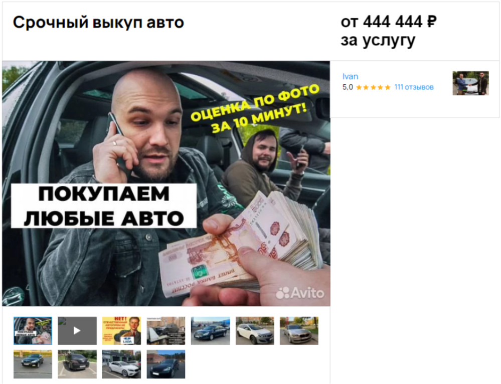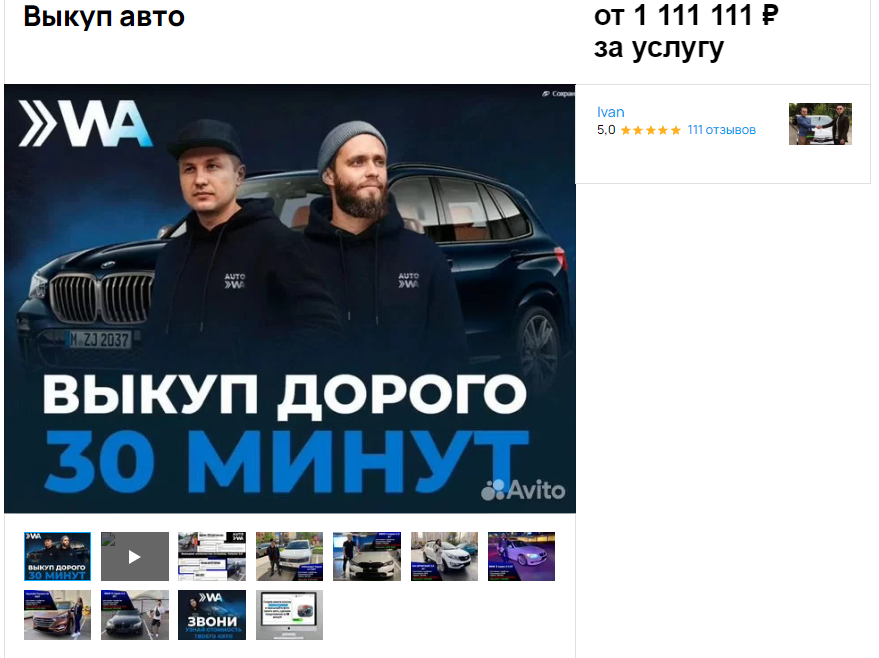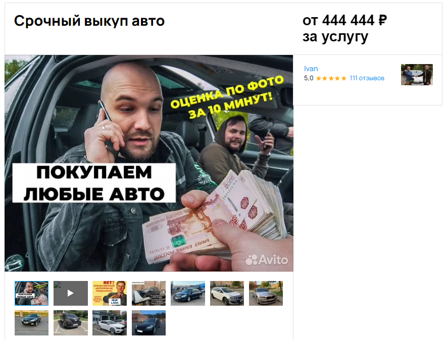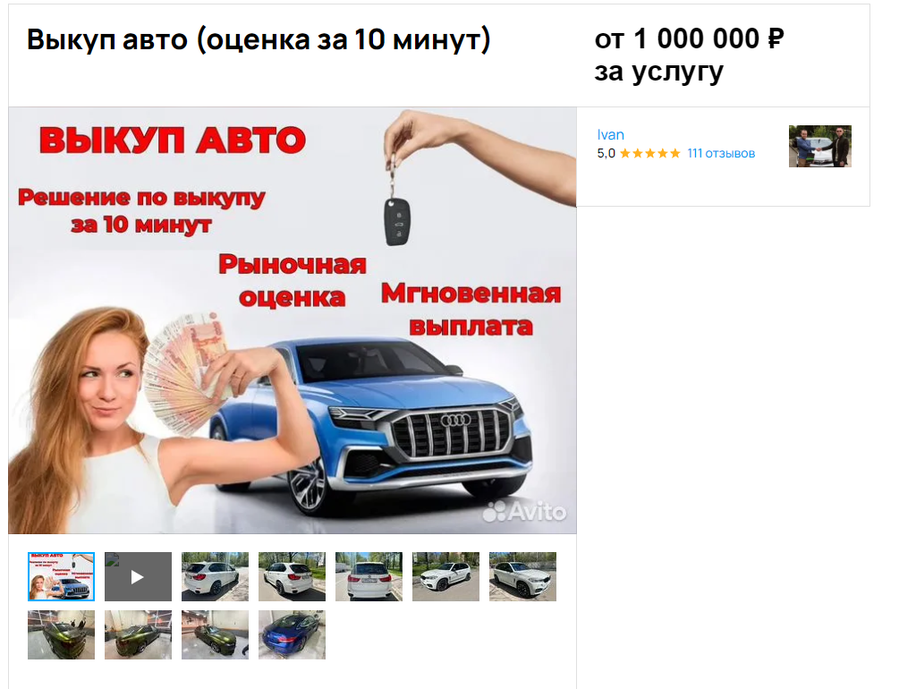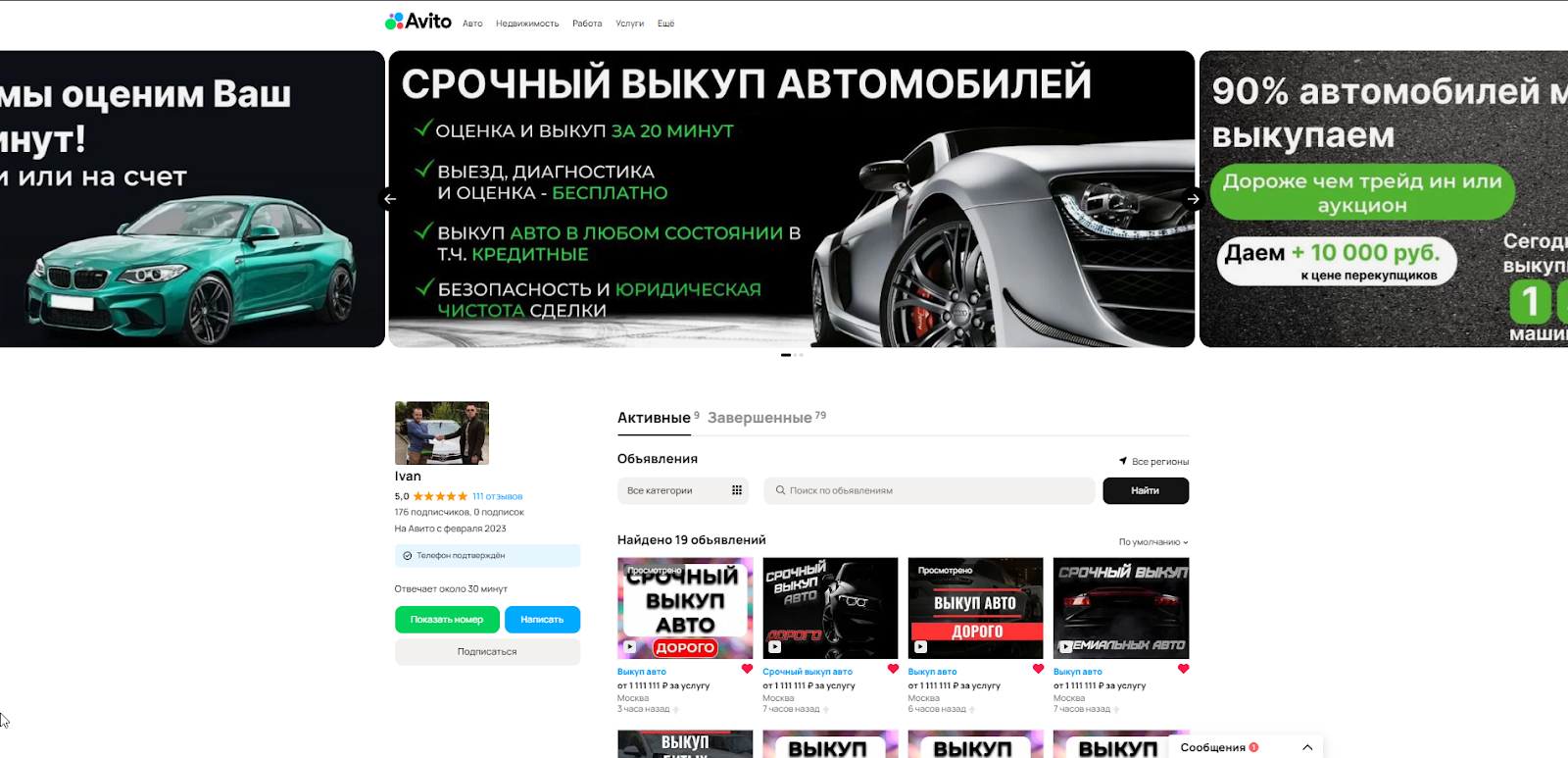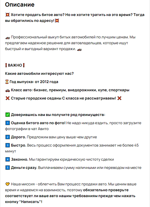 Информацию для текста мы получили от клиента и на основе анализа конкурентов. Мы подготовили описание с ключевыми преимуществами и нашей «продающей» структурой.Также, очень важно было в тексте подчеркнуть целевую аудиторию клиента и отфильтровать потенциально нецелевые заявки. Для этого мы внедрили отдельный блок в описании, в котором постарались максимально точно ограничить сферу наших интересов. По фотографиям мы тестировали разные связки и по итогам определили следующий набор фото, который позволяет получать самый высокий CTR: Проект стартовал с 10 июля, на протяжении нескольких месяцев мы: Итоги первого месяца показали, что клиент может получать с Авито до 4 целевых машин для выкупа, которые принесли нашему клиенту около 1 000 000 рублей прибыли. Это нормальная конверсия, с которой мы можем продолжать работать и стараться улучшать ее. При ведении проекта мы несколько раз вносили корректировки для улучшения результата: Пример работы чат бота: Скорость ответа до подключения чат бота: Скорость ответа после внедрения чат бота: Итоги первого месяца показали, что клиент получает с Авито целевые заявки по адекватной цене, но есть желание увеличить их количество. По итогам 1 месяца мы получили 1298 просмотров и 183 контакта. По итогам первого месяца мы сделали выводы и придумали новые действия, которые позволят увеличить количество заявок — увеличили количество объявлений, усилили платное продвижение и добавили в объявления новые кликабельные баннеры. Статистика показывает, что мы получили на 50% больше заявок в сравнении с прошлым месяцем: 2915 просмотров и 332 контакта На данный момент, для поддержания и улучшения результата мы постоянно вносим корректировки в рекламную кампанию и подключаем новые инструменты. До После Это инструмент, который позволяет регулярно индексировать наши объявления, чтобы находиться в выдаче. Основной механизм заключается в том, чтобы на аккаунте оставались объявления, которые дают результат, а те объявления — которые не собирают просмотры или имеют низкий конверсию скрывались. По итогам работы на начало 3 месяца мы постоянно находимся в топе выдачи по основному ключевому запросу «выкуп авто», а остальные наши объявления видят посетители 2-3 страниц выдачи на Авито. Работу с проектом мы начали в июле 2023 года и на данный момент работа продолжается. По итогам 2,5 месяцев работы получили 4 822 просмотра и 625 контактов при бюджете в 339 116 рублей. Клиент выкупил более 10 машин с общей прибылью около 2-х миллионов рублей! В завершение хочется сказать спасибо всем, кто дочитал кейс до конца. Помните, что Авито — отличный источник получения горячих заявок! Будем рады ответить на ваши вопросы — пишите!