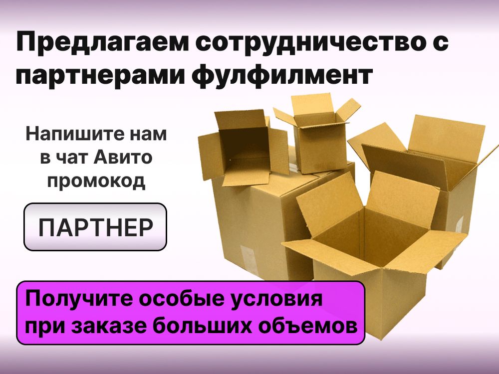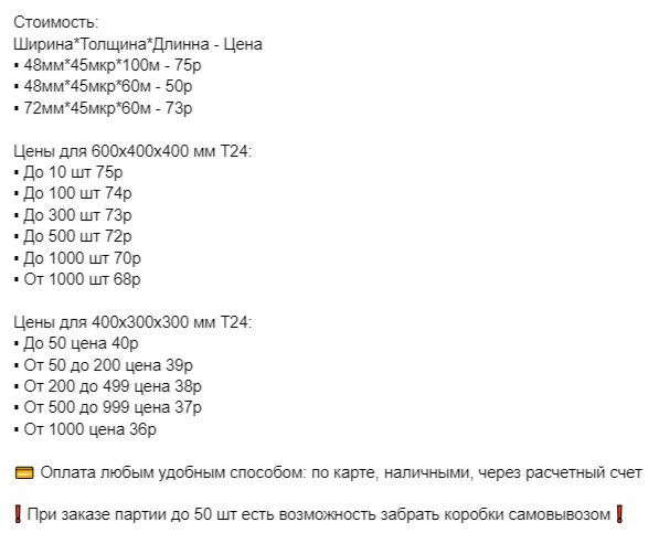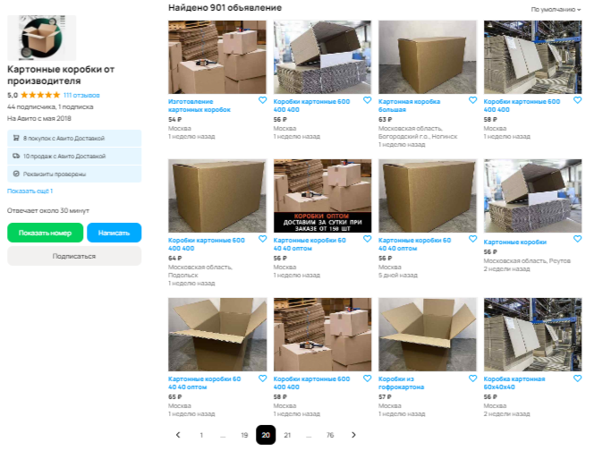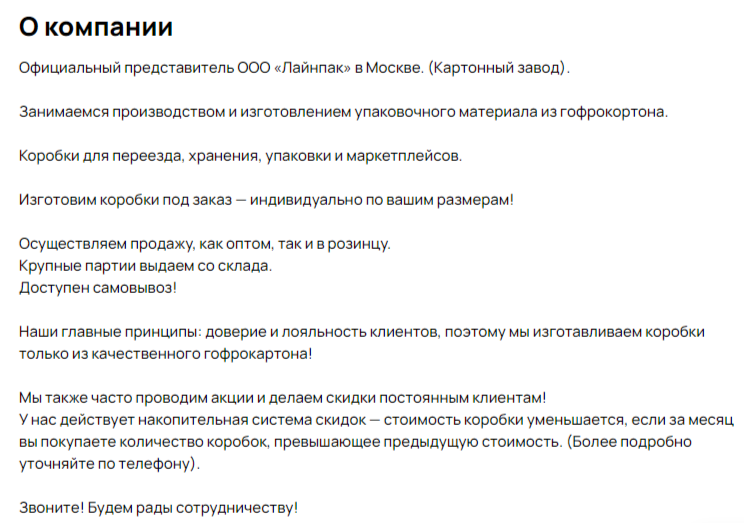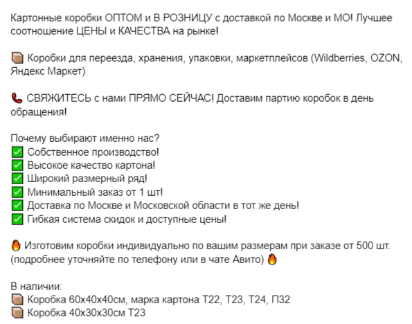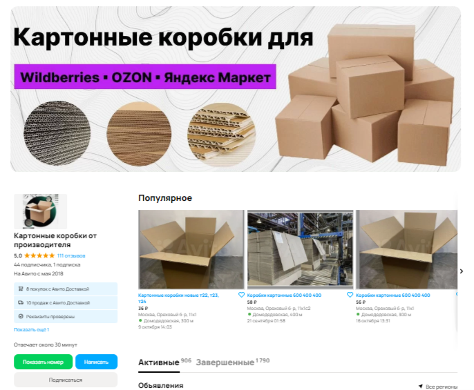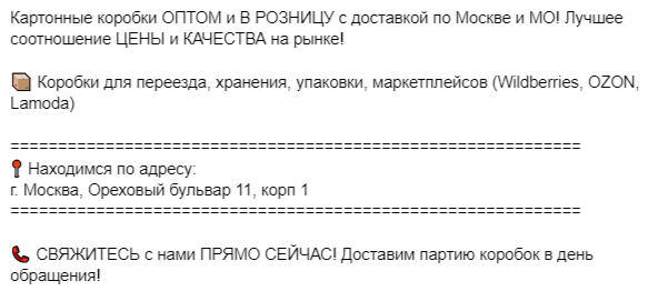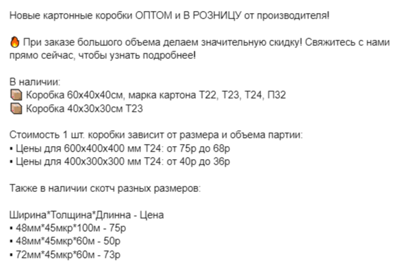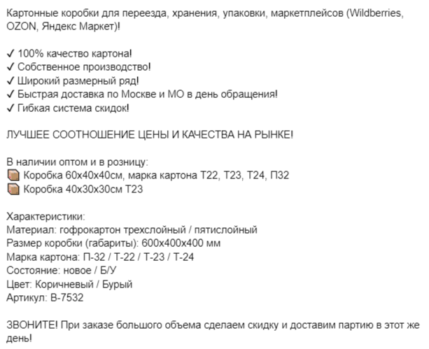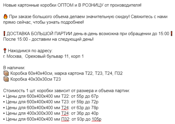 Здесь был сделан акцент на фотографии коробок со склада / производства. Преимущественно показаны коробки в большом количестве — для ЦА, настроенной на опт.