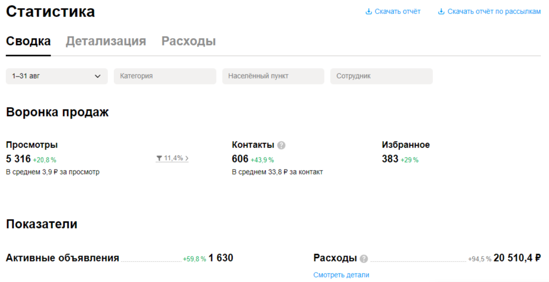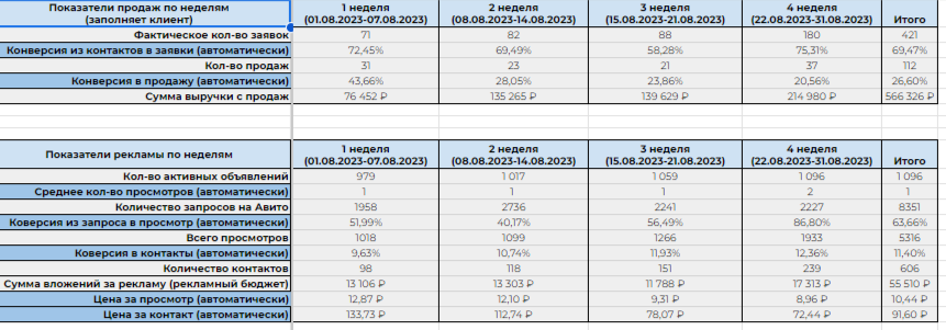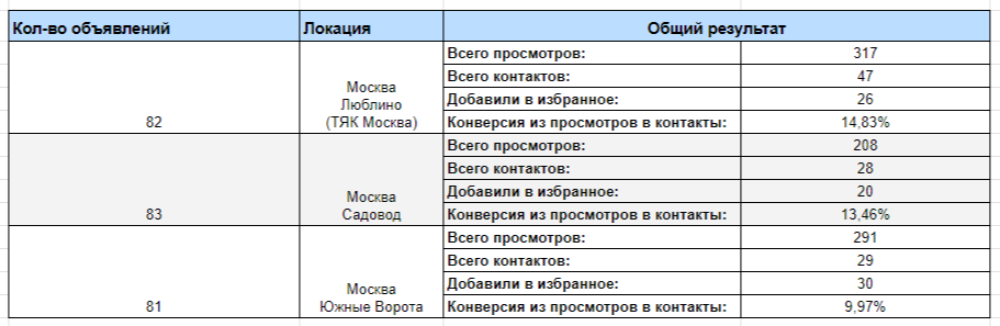 Текст 1: Текст 2: Текст 3: Профиль оформили, как профессиональный магазин. Для этого мы подготовили баннер, добавили витрину с лучшими объявлениями в раздел «популярное». Также добавили описание профиля и информацию про доставку и способы оплаты. Часть 3: корректировки и оптимизации Работа над проектом активно ведется уже 4 месяца и на протяжении этого времени мы оптимизировали рекламную кампанию для получения лучших результатов. Проект был запущен в середине июня, и чтобы клиенту было удобнее заполнять отчетность первый период ведения решили продлить до конца июля. Таким образом первый период работы составил полтора месяца. Итоги за первые 1.5 месяца показали, что компания получает с Авито целевые заявки по отличной цене и в нужном количестве. План по контактам на первый месяц был перевыполнен на 303% — 594 контакта при прогнозе в 196! Кампания с первого месяца показала себя результативной — уже к середине месяца мы стабильно находились на первой странице в выдаче и собирали большое количество трафика. Конверсия в контакты была средней для этой ниши — 10,22%. В последующие месяцы для поддержания и улучшения результата мы вносили корректировки в рекламную кампанию и подключали новые инструменты. По итогам первого месяца мы сделали выводы и придумали новые действия, которые позволят увеличить количество заявок — убрали из постинга локации, которые не приносят результат и также добавили размещение объявлений в трех главных торговых точках Москвы: Такие действия позволили нам в августе увеличить количество просмотров на 20,8% и количество контактов на 43,9%. Результаты рекламной кампании за август Для того, чтобы наглядно видеть результаты внесенных корректировок, мы каждую неделю проводили аналитику по объявлениям и отдельно собирали результаты по трем новым локациям: Садовод, ЮВ, ТЯК. По итогам первого месяца мы заметили, что многие клиенты невнимательно читают текст объявлений — чаще всего не дочитывают текст до конца и не обращают внимания на определенные условия, которые прописаны. Так как по стратегии помимо настоящего адреса магазина объявления размещались во многих других городах МО. У некоторых клиентов такая ситуация вызывала недовольство, так как при заказе товаров приходилось выделять дополнительный бюджет на доставку. Поэтому, чтобы избежать негатива покупателей мы добавили адрес магазина в начало текстов объявлений + выделили данный пункт, чтобы он визуально был заметен: Для привлечения клиентов сегмента b2b было принято решение прописать в начале текстов информацию про условия заказа больших партий товара. Также мы расширили в текстах блоки с ценами на доступные позиции, чтобы у клиентов было четкое понимание стоимости каждого объема. Чтобы наши объявления выделялись среди объявлений конкурентов в выдаче Авито, и чтобы привлечь больше клиентов, нацеленных на оптовые закупки мы добавили на первую фотографию надписи с акцентом на выгоду при заказе большого объема товара. Также для привлечения клиентов b2b сегмента мы подготовили фотографии с инфографикой для 3 и 4 позиции фото в объявлениях. Акцент в одной из фотографий был сделан на особые условия, которые клиенты получат при долгосрочном сотрудничестве — накопительная система скидок + качественный товар в большом объеме по ценам ниже рыночных. Другая фотогр