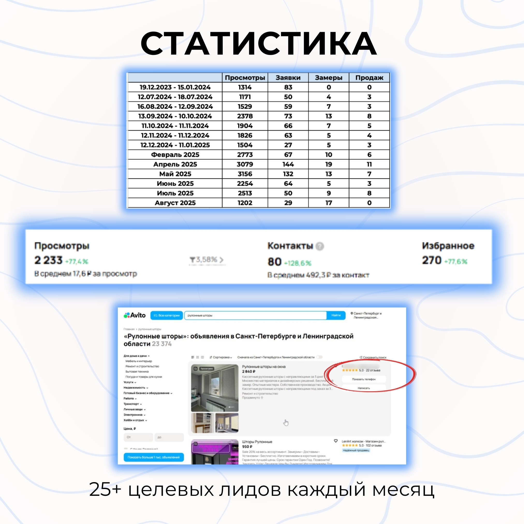 Однако анализ показал снижение просмотров, что повлияло на общую статистику. Повторное исследование ниши и конкурентов в марте выявило устаревание визуального контента как ключевую проблему. Этап 3: Оптимизация и рост В апреле 2025 года авитологи Семги провели повторный отбор фотографий на основе анализа сводных таблиц, добавив новые конверсионные изображения в постинг. Это решение стало переломным: Результаты апреля 2025 года: — Инвестиции: 88 396 руб. — Просмотры объявлений: 3 079 — Количество замеров: 19 — Средняя стоимость замера: 4 652 руб. — Заключенные сделки: 11 — Общая выручка: 290 400 руб. Итоги и достижения Благодаря комплексному подходу — глубокому анализу конкурентов, продуманному контенту и постоянной оптимизации — мы добились значительных результатов: — Увеличение количества продаж с 6 до 11 сделок за три месяца. — Достижение месячной выручки более 290 000 руб. — Расширение географии продаж до 50 городов. Вывод: ключевые уроки и перспективы Этот кейс демонстрирует, что даже в конкурентной нише, такой как производство рулонных штор и жалюзи, можно выстроить успешную стратегию продвижения на Авито. Гибкость в адаптации к изменениям, регулярное тестирование контента и акцент на данные позволили превратить локальный проект в масштабируемый бизнес. Формула успеха проста: аналитика, креативность и постоянное улучшение процессов. Мы продолжаем развивать проект, изучая новые регионы и форматы. Если у вас есть вопросы или желание обсудить свой кейс, пишите нам — готовы поделиться опытом! 💼 *Автор: Команда экспертов агентства «Семга»