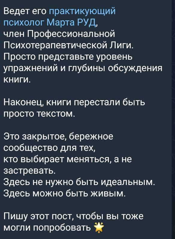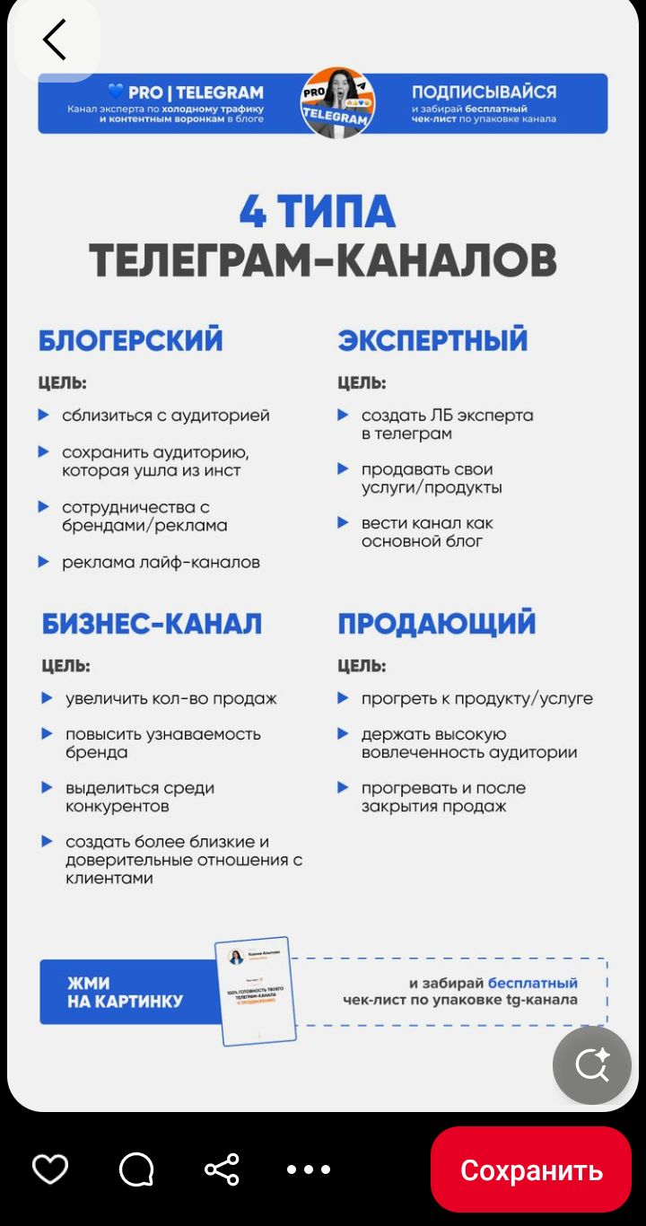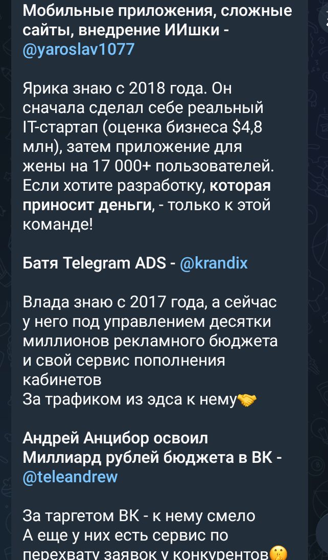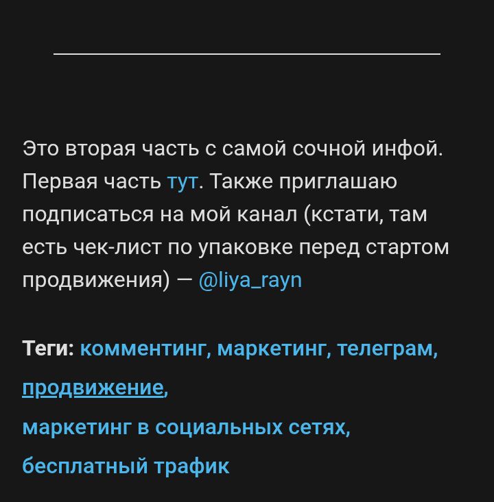 → как чат нетворкинга — это отдельная группа для, например, начинающих предпринимателей, где скидывают свои каналы вместе со статьями (так сделали Т-Бизнес Секреты) Как только вы видите подобный пост, особенно в большом канале, сразу же скидывайте свой шаблон, иначе ваш комментарий упадёт вниз и никто ниче не увидит. Как составить продающий шаблон (вообще их должно быть несколько) ↓ — представление+УТП. Пример: "Я Маша, юрист по гражданскому праву с опытом Х лет, работаю с этим, этим, этим"— сначала кейсы, потом регалии (если есть). Пример: "вернула клиенту 10 млн у наставника наставников«— презентация канала+интересные посты. Пример: «веду канал об этом и этом (темы по болям и на языке ЦА), вот здесь рассказала об этом (выбираете самые крутые посты, которые зацепят ЦА)». Ещё можно добавить хобби, если на нетворкинге это уместно. Составьте разные шаблоны: где-то понадобится презентация без канала, где-то только о нём, а где-то вы выделитесь интересной историей из жизни или увлечениями. Как вы знаете, статьи на Хабре или виси пишутся для продвижения. Даже если ссылка на канал не указана, автор получает заявки в работу через личные сообщения (у меня так). В статьях есть несколько ключевых моментов ↓ 4. пишите регулярно. В идеале, несколько раз в неделю по большой статье 5. дублируйте контент на несколько площадок. Например, технические статьи зайдут не только на Хабре, но и на дтф В первую очередь, это обмен постами. Бесплатно. ВП возможен только если у вас и второго автора схожее количество подписчиков и вашей аудитории интересны темы обоих каналов. Какие ещё есть варианты ↓ — подкаст/совместный эфир Вы приходите в канал другого эксперта или проводите в своём, но запись/анонс трансляции будет в обоих блогах. — подборка каналов/постов Вы можете оплатить участие в подборке или выложить её взаимно у себя. Так организатор получит бесплатную рекламу сразу в нескольких блогах. — марафон/челлендж с экспертом На время проведения такого продукта вы с партнёром постоянно рассказываете друг о друге в блогах. — ценный розыгрыш/конкурс Здесь будьте крайне осторожны, чтобы не привлечь внимание халявщиков. Призами делайте свои продукты и услуги. Постом с анонсом конкурса обменивайтесь с другими экспертами, их продукты обязательно добавьте в список призов. Теперь к самому алгоритму и особенностям. ВП надо маркировать — это основное, что запоминаем. По сути, это такая же реклама, только бесплатная. Выбирать каналы надо с условием, что там живая аудитория, регулярный контент. Что людям будет реально интересна рекомендация автора и они к вам перейдут. В вашем случае также. ВП можно и нужно делать креативно: то есть, вы придумываете какой-то интересный заход, какую-то движуху (если люди вовлекутся и получат экспертную пользу с вашей стороны — подписок будет больше). Как делаем ВП? Собираем каналы → пишем шаблон с предложением (обязательно указать свой охват со скринами из тг стат, нишу, кол-во аудитории, ссылку на канал, подчеркнуть, что обмен аудиторией хотите бесплатный) → готовим с автором взаимные посты или интерактив на каналах → поживаем плоды. Не сказать, что ныне работающий способ, т. к. каналов много и подписываются через рекламу или комментинг больше. Но все же иногда подписчики приходят и оттуда. → каталог от TGPages. Это атлас с 500 тысячами телеграм-кан