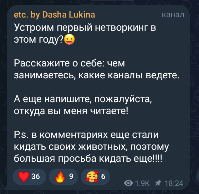 → как разновидность комментинга — когда вы скидываете заранее заготовленный шаблон под постом с нетворкингом и люди переходят на канал