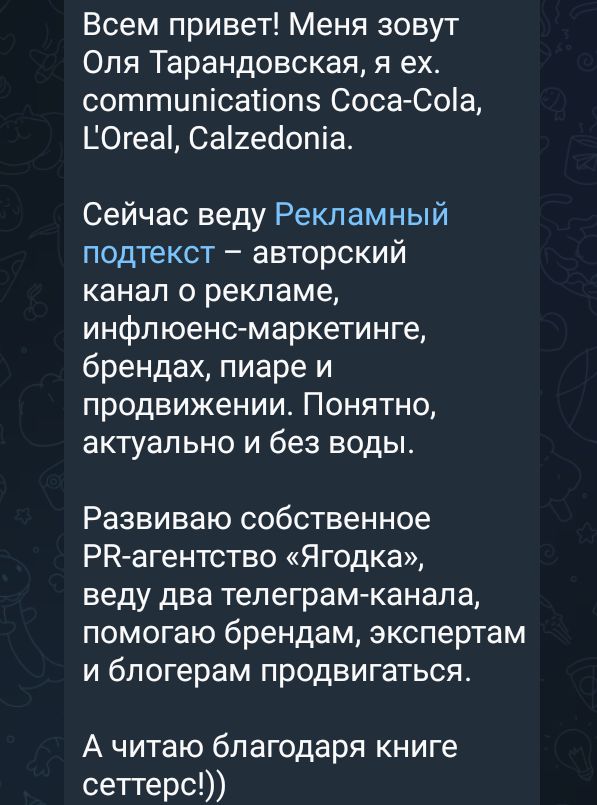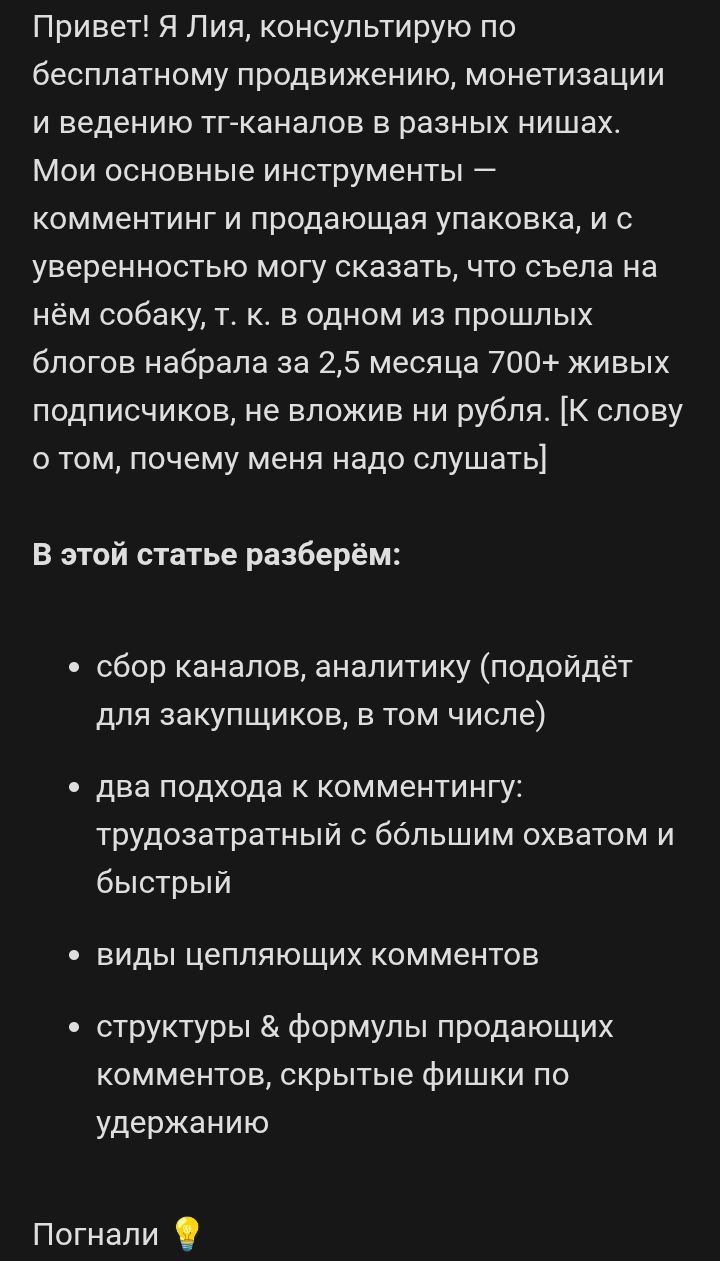 Привет! Я Лия, консультирую по бесплатному продвижению, монетизации и ведению тг-каналов в разных нишах. Мои основные инструменты — бесплатное продвижение и продающая упаковка, и с уверенностью могу сказать, что съела на органическом трафике собаку, т. к. в одном из прошлых блогов набрала за 2,5 месяца 700+ живых подписчиков, не вложив ни рубля. [К слову о том, почему меня надо слушать]