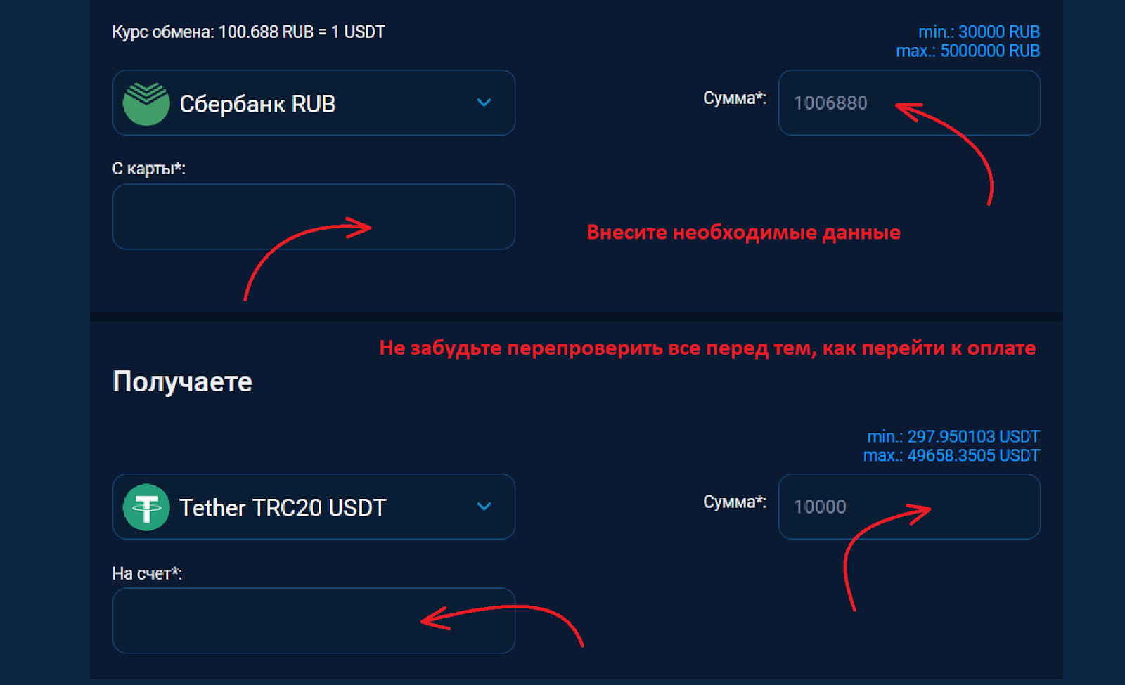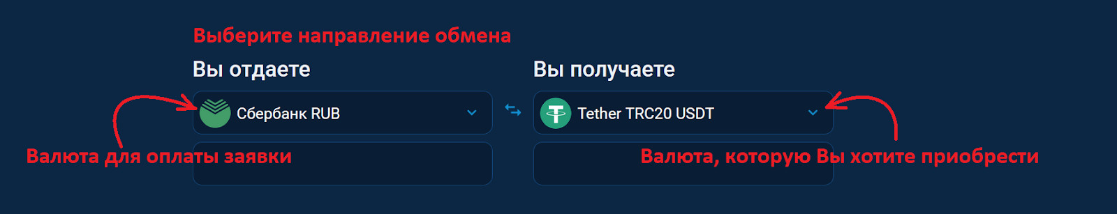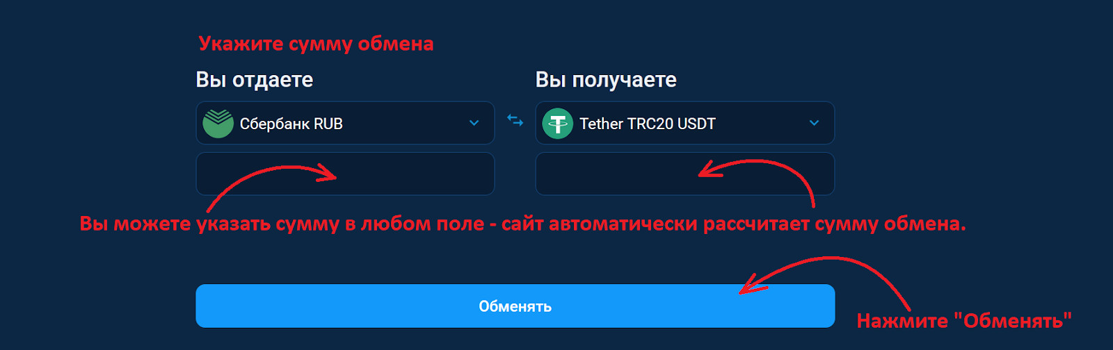 Шаг 3: Выбор направления, криптовалюты и суммы обмена