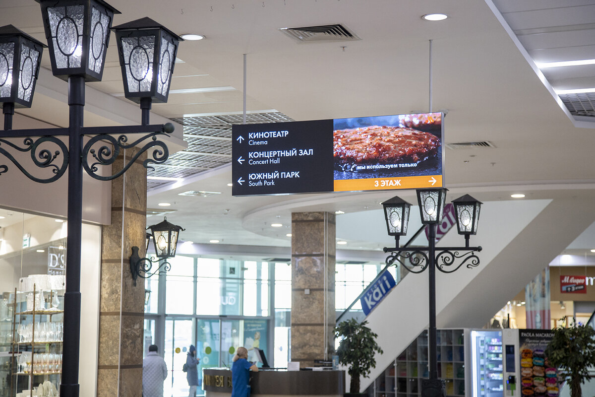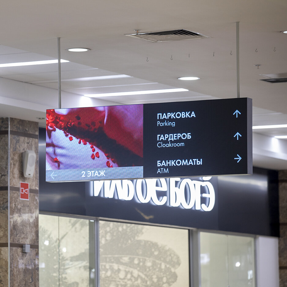 Представьте, в 3х этажном ТРЦ более 50 указателей, и при каждой смене арендатора приходится заказывать новый пластик, да и монтаж под потолком это не просто и не бюджетно.
