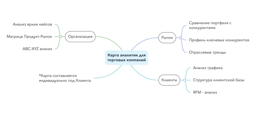 1. В первую очередь, необходимо составить карту «умной аналитики». Это набор данных о рынке, клиентах, конкурентах и самой компании. Важно иметь не менее 7-10 аналитик, которые: