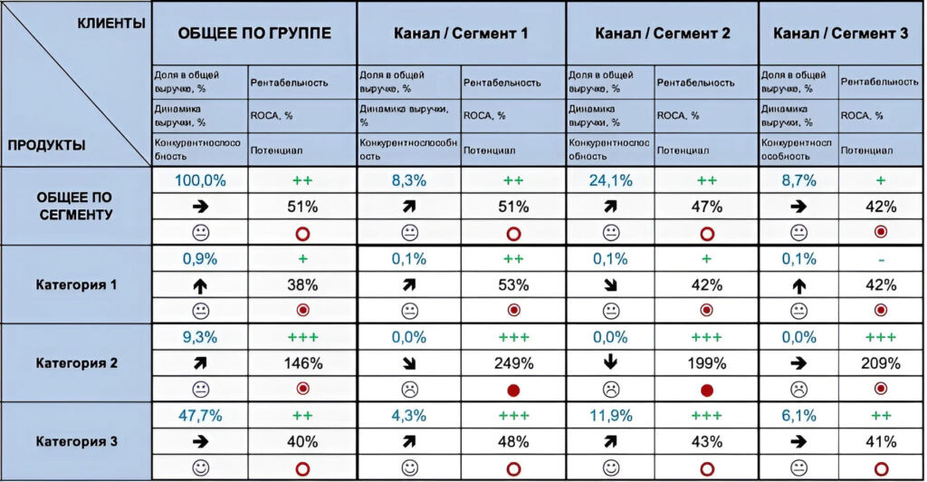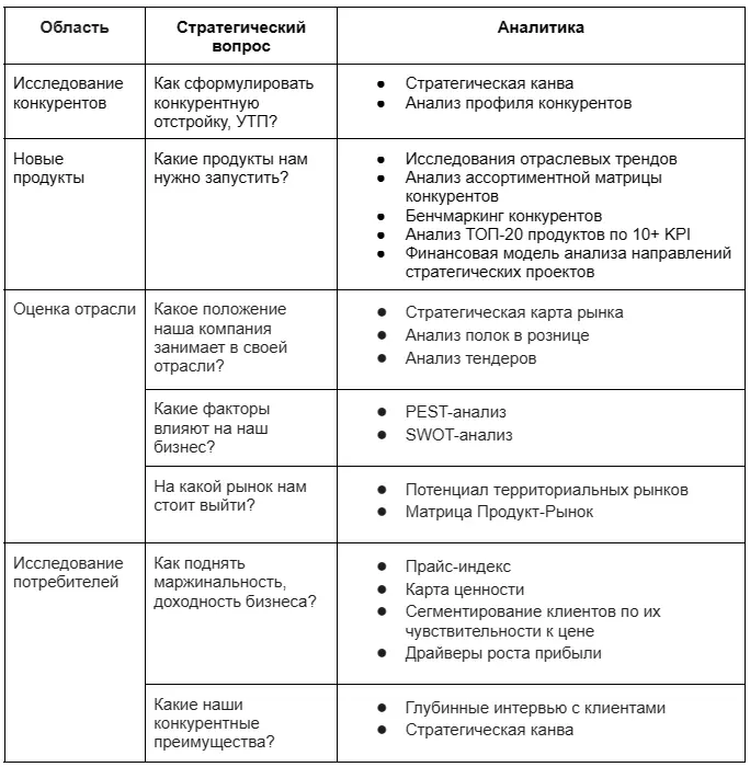 Таким образом, благодаря стратегическим вопросам мы определяем, какие именно аспекты анализа будут для нас полезны. Мы подготовили таблицу, в которой подобрали стратегические вопросы к каждой области изучения рынка и аналитики, которые помогут ответить на этот вопрос: Select an Image Анализ рынка затрагивает несколько ключевых областей, каждая из которых имеет важное значение для понимания рыночной среды и формирования стратегии бизнеса. Вот основные направления, на которые мы обращаем внимание: Матрица Продукт-Рынок Select an Image По вертикали — обслуживаемые сегменты клиентов (или каналы продаж).