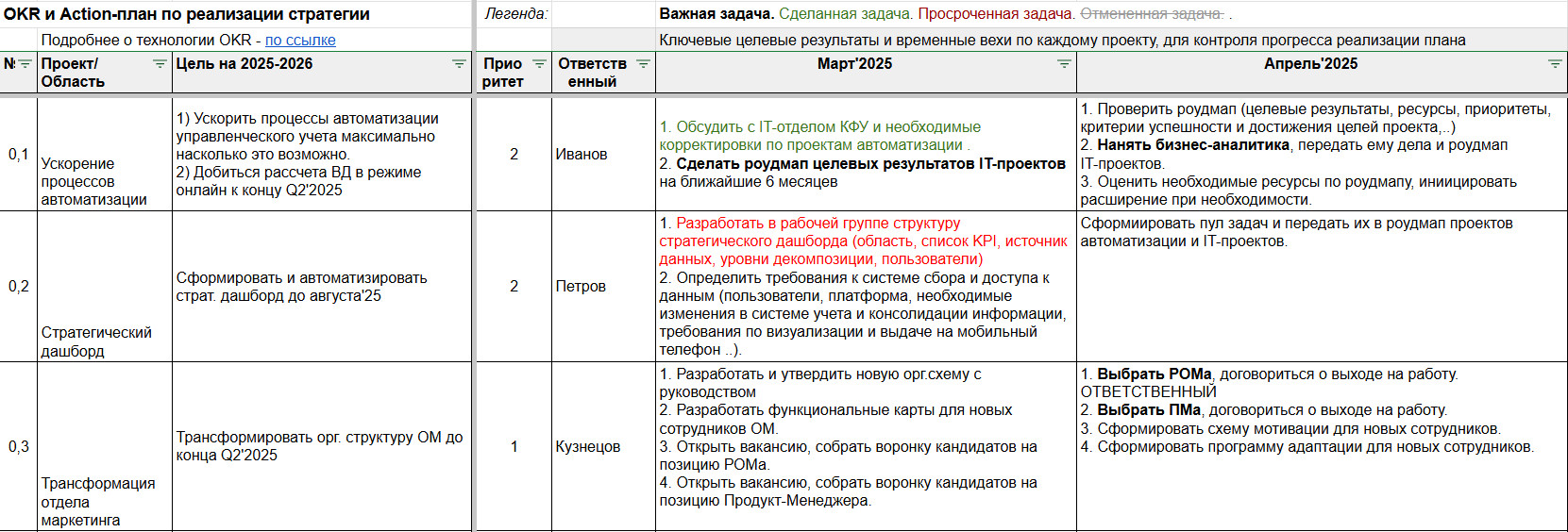 по проведению стратегической сессии. Даже самая блестящая стратегия ничего не стоит без реализации. Этот этап — мост от намерений к действиям. Action-план — это рабочий документ, который содержит: Также обязательно проводится сессия коммуникации стратегии команде: чтобы каждый понимал не только, «что делать», но и «зачем именно так». Это важный момент — вовлечённость начинается с понимания. Разработка стратегии — это только половина работы. Реальная ценность стратегии раскрывается в момент, когда она начинает жить в ежедневных действиях команды. И здесь важна не только структура, но и управленческая дисциплина. Здесь подробнее