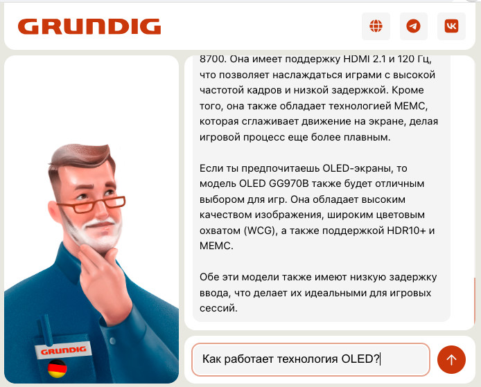 Папа Grundig — это первый виртуальный консультант для шопинга, который не привязан к отдельному сайту. Плагин для браузера работает на основе ChatGPT, и обучен на массивах данных о технологиях от экспертов Grundig. Использование в разработке нейросетей позволяет ассистенту отвечать на любые вопросы о технологиях телевизоров, как бы они ни были сформулированы. Расширение можно включать в любом маркетплейсе или онлайн-магазине, что делает его идеально подходящим при сравнении предложений во время шопинга.