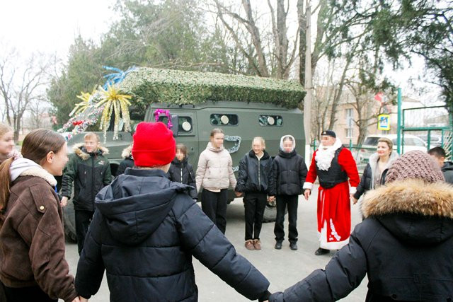 В рамках ведомственной акции «Дед Мороз специального назначения» главный волшебник ведомства прибыл к воспитанникам Генической санаторной школы-интернат на боевом автомобиле и привез сладкие подарки для праздничного стола, которые ребята доставали из военных ящиков.