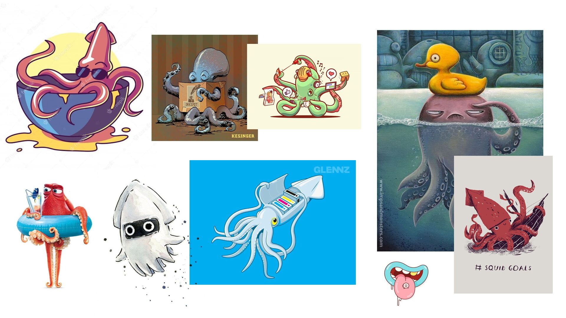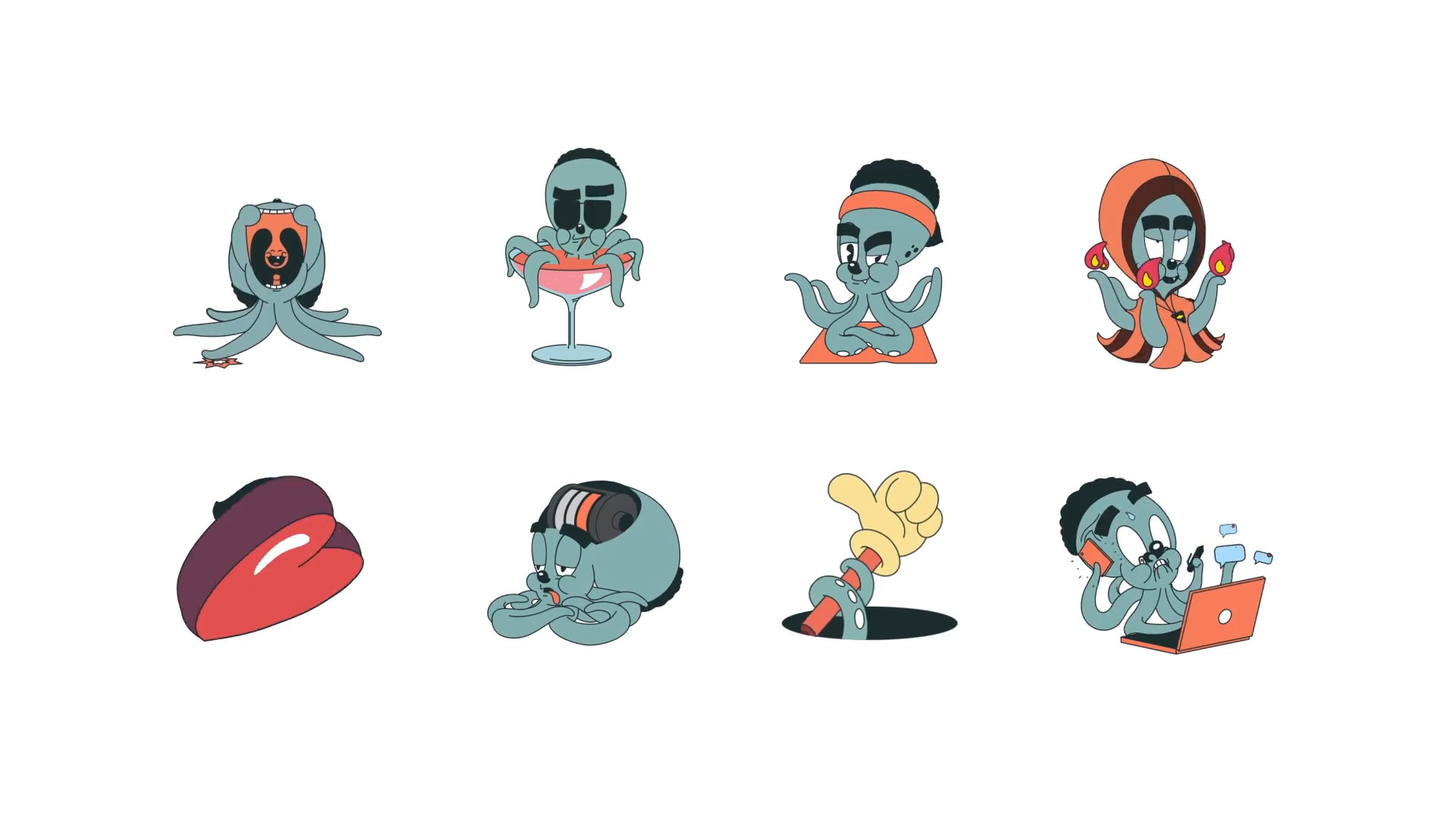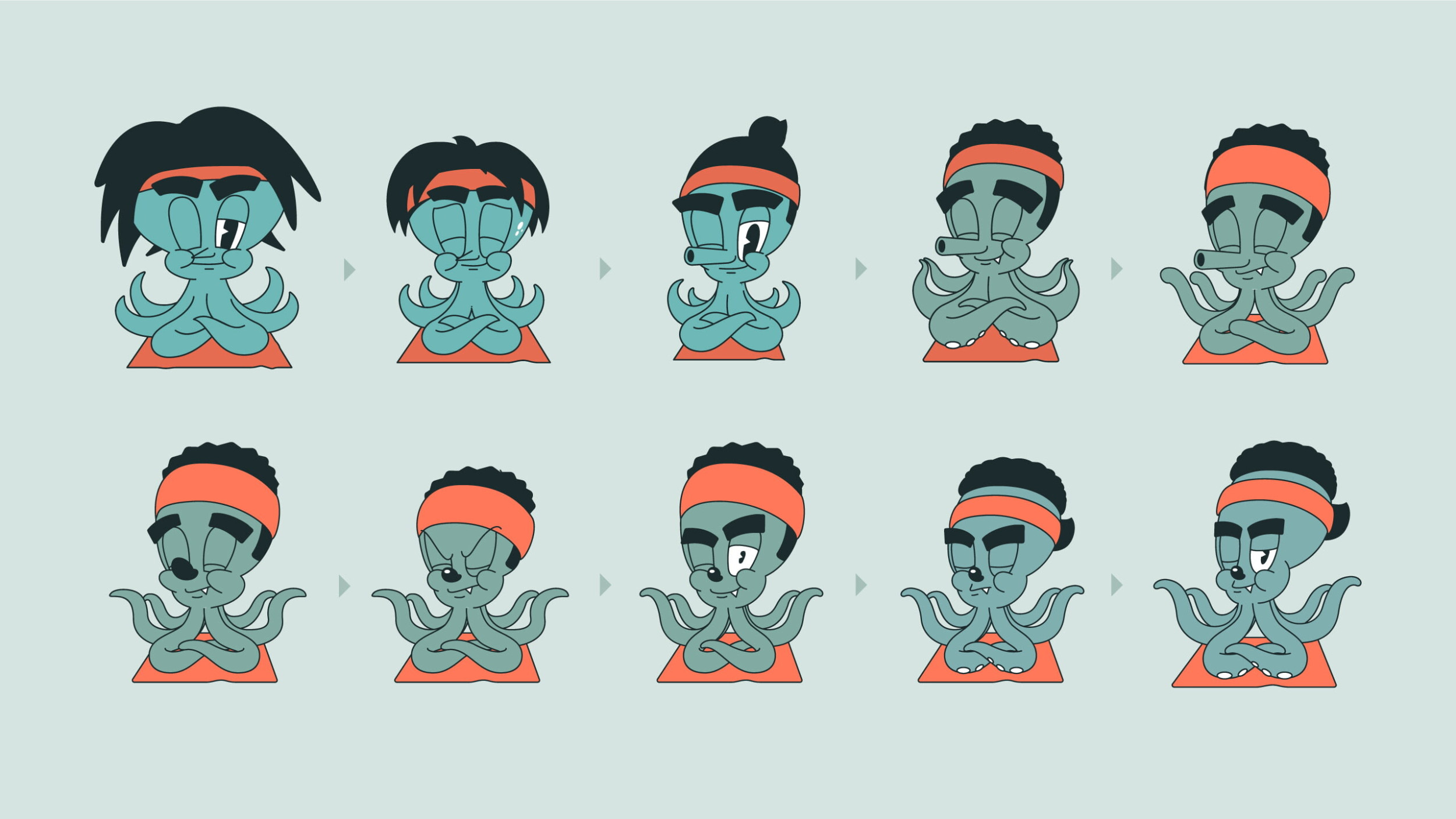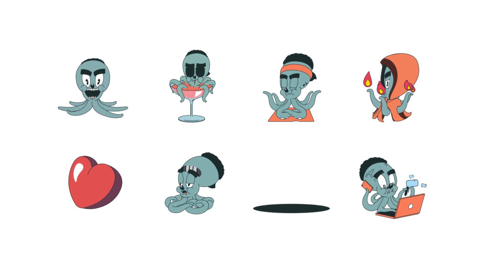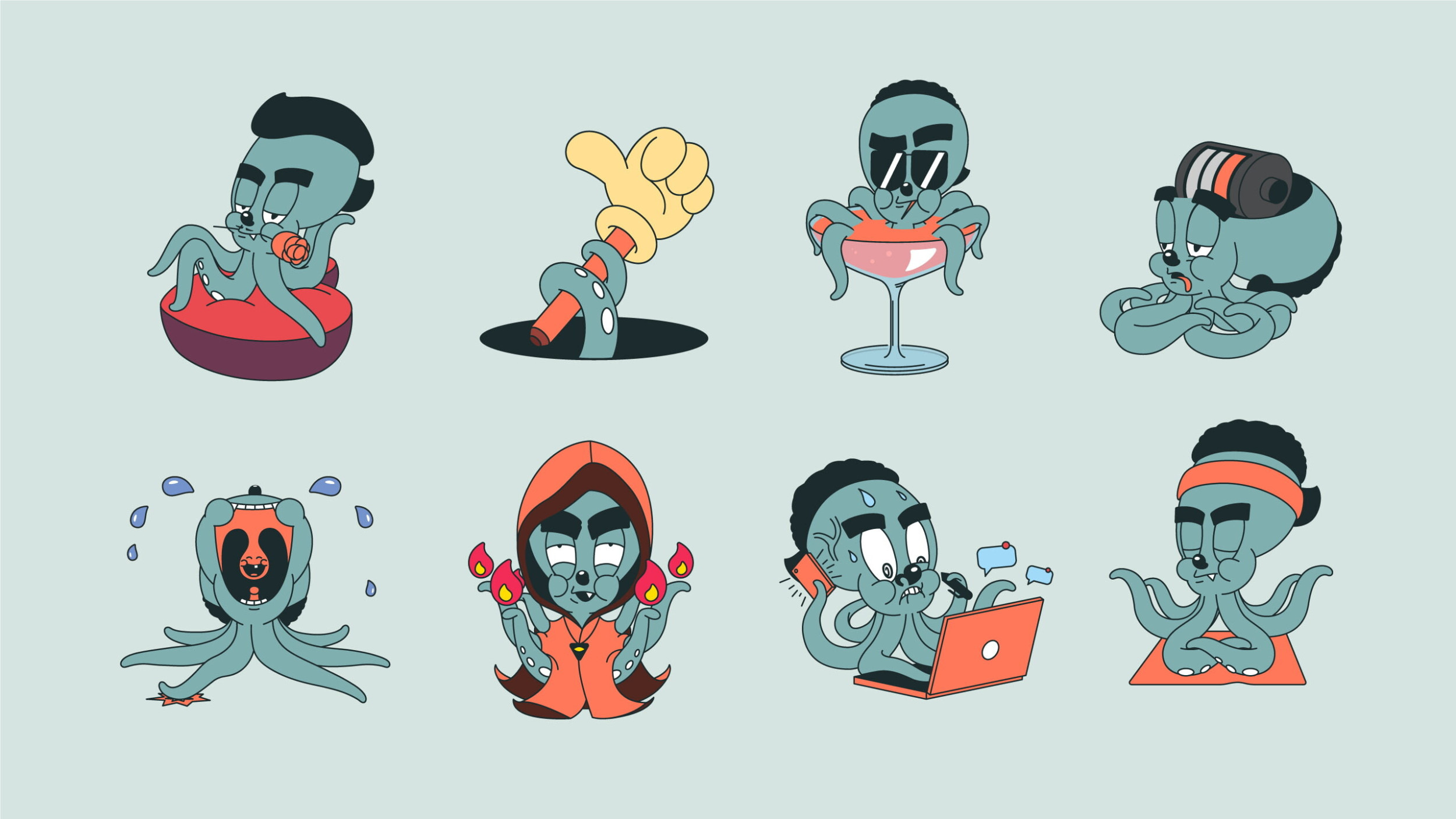 Желание удивить коллег только добавило фана в процесс, ведь теперь это уже не просто кейс, а полноценный заказ на любимую эмоцию. Так, по стикеру «В огне» пришлось даже немного забрифовать коллегу, что придало созданной эмодзи более персональный окрас. Тут важно учитывать экспертизу в моушн-дизайне, в дизайне персонажей и в персонажной анимации. Первое — уверенно умеем, второе — высокая насмотренность и несколько проектов за плечами, третье — делаем впервые. По большей части мы работаем с более абстрактными понятиями для клиентов, и разработка бренд-героя не очень частый запрос. И это еще один повод сделать анимированный персонажный стикерпак.Какие подзадачи мы ставили, чтобы найти образ героя: а) Выбрать характер героя. При поиске удачного характера мы шли от ценностей, применяемых в агентстве. б) Выбрать эстетику иллюстрации. Здесь мы шли от принципа «такого мы не видели». Провели небольшое изучение, текущих стилей в ТГ. Что выделили: Чтобы быть понятными массовой аудитории, мы остались в рамках мультяшек, но в визуле пошли против системы: выбрали своей эстетикой американские мультфильмы 30-50х годов от Fleischer Studios, Disney и недавнего Cuphead. Где атмосфера странности и даже безумия пропитывала каждый кадр. в) Определить пластику и детализацию персонажа. В поиске решения, наиболее оптимального по соотношению времени и результата, мы пришли к... осьминогу. Да, плавные, изгибающиеся объекты делать проще, чем скелетную анимацию. Плюс осьминог прекрасно вписался в концепт: таких героев почти нет в ТГ, он символизирует многозадачность, и появился челлендж, сделать его не так, как мы привыкли видеть в мультфильмах. г) Определить узнаваемый элемент в образе. Как рождался ключевой образ, вы можете увидеть на картинке ниже, тут все наглядно. Для запоминаемости сделали ему гигантские брови, выразительный нос и современную прическу. Сформировав образ героя, стало легче представить, насколько странными делами он будет заниматься для выражения эмоций.Начали со сбора референсов, чтобы синхронизироваться по мимике и позам. После генерации идей начали отбирать их по следующим принципам: Можно назвать это ритмом стикерпака. Мы даем зрителю разнообразие в визуале, изменяя, то направление фигуры, то меняя силуэт засчет одежды, то убирая героя вовсе. Все это делает набор разрозненных эмодзи цельным паком. На продакшене сначала отрисовали все позы и состояния в Illustrator, а потом долго и упорно анимировали в After Effects. Возможно, кто-то скажет «это же обычный стикерпак в телегу, камон! зачем целая статья?». Но оказывается такого контента нет в вебе, и мы очень хотели бы такой гайд, чтобы понимать, насколько это трудозатратный и технически сложный путь. Оказалось, все реально даже в первый раз. Плюс тот, кто прочитал первую часть материала, получил еще и небольшой чек-лист по созданию персонажа, который можно применить и для создания бренд-героев. Ну, а мы с радостью выдыхаем и делимся с вами этим забавным и уже родным осьминогом по имени Осси. Делали стикеры, а получился маскот.