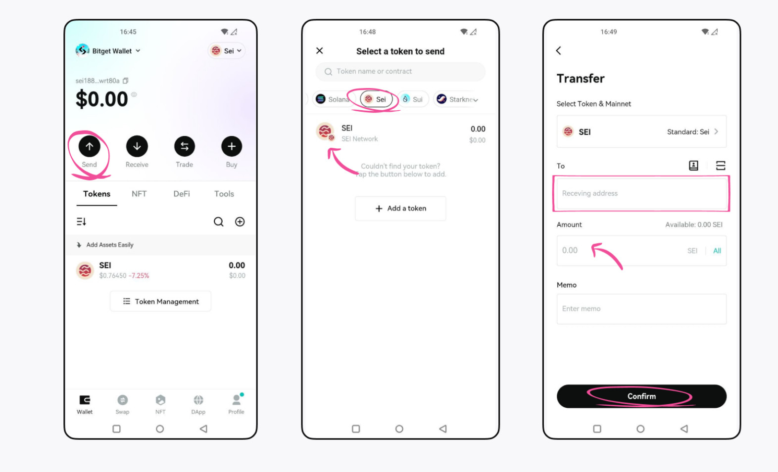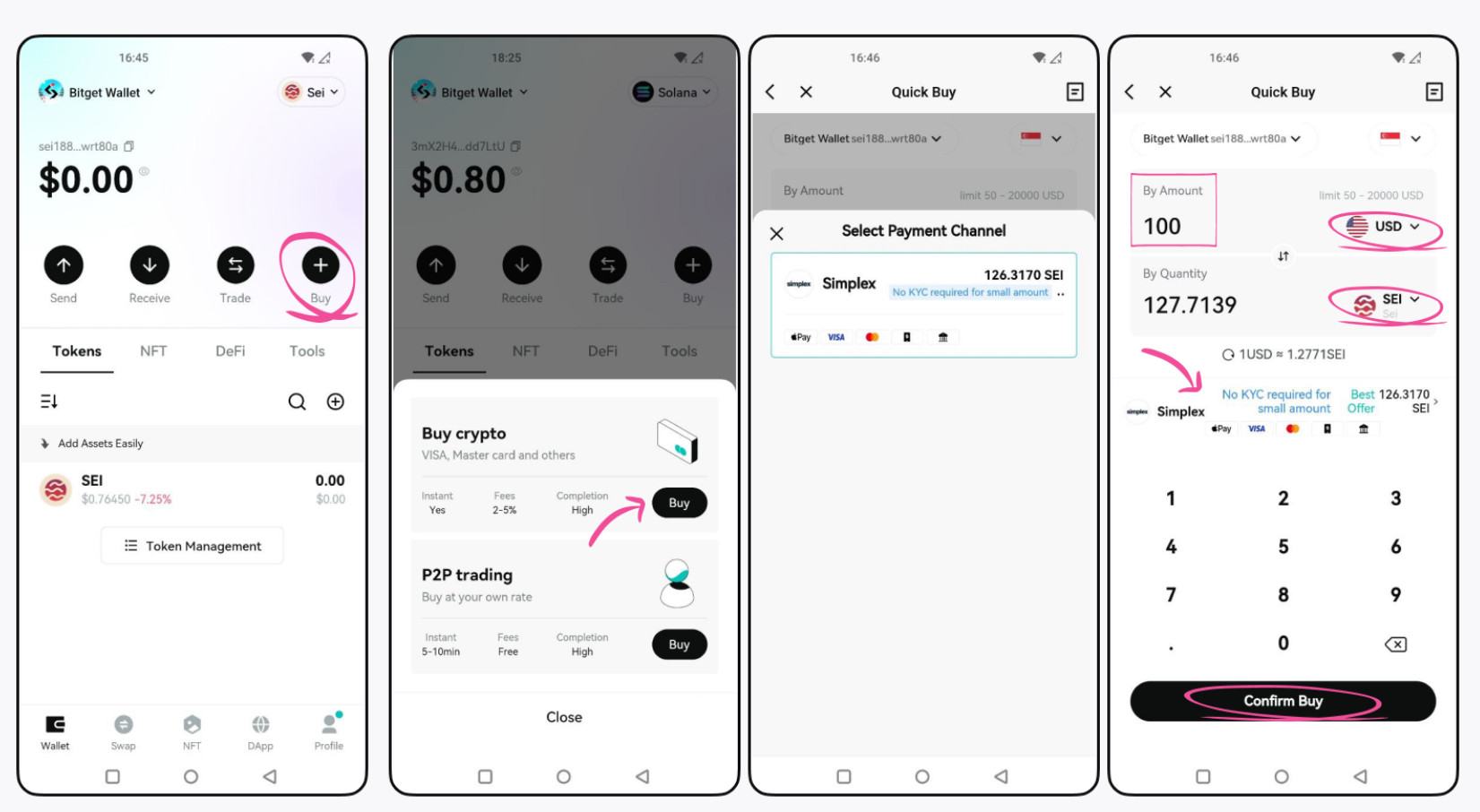 Bitget Wallet — это универсальный криптокошелек Web3, поддерживающий более 90 блокчейнов и 250 000+ криптовалют, предлагающий конкурентные обменные курсы и бесшовную интеграцию с DApp. Как пополнить криптокошелек SEI? Чтобы пополнить свой кошелек SEI с других криптовалютных кошельков или бирж, просто: Помните, что очень важно перепроверить адрес и подтвердить совместимость с сетью, прежде чем завершить процесс пополнения счета. Как перевести SEI на другие криптокошельки? Чтобы перевести SEI с вашего кошелька Sei на другие криптокошельки или биржи, просто: Помните, что очень важно перепроверить адрес и подтвердить совместимость с сетью, прежде чем завершить процесс пополнения счета. Как купить SEI с помощью кошелька Bitget? Bitget Wallet предоставляет различные способы оплаты для покупки SEI, что повышает удобство для пользователей. Благодаря внебиржевому сервису Bitget Wallet обеспечивает беспрепятственную покупку SEI с использованием фиатных валют. К оплате принимаются Visa, Mastercard, Apple Pay, Google Pay и кредитные карты USD. Чтобы приобрести SEI через Bitget Wallet, просто: После этого SEI будет автоматически добавлена в ваш кошелек. Минимальная сумма покупки обычно составляет от 10 до 50 долларов. Как купить и продать SEI на криптовалютной бирже? Чтобы купить и продать SEI на криптовалютной бирже, например, на бирже Bitget, выполните следующие действия: Эта процедура удобна для пользователя и аналогична как компьютерному интерфейсу, так и мобильному приложению.