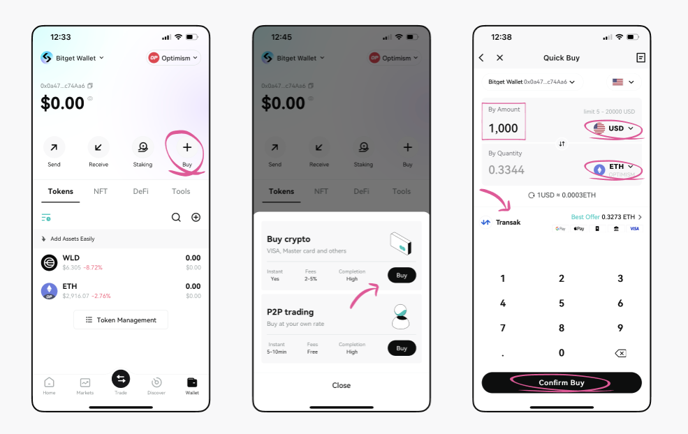 Прежде чем покупать Worldcoin (WLD), необходимо сначала хранить криптовалюты, такие как ETH, в сети Optimism. Если у вас нет этих активов, Bitget Wallet предлагает внебиржевую услугу (OTC), где вы можете приобрести криптовалюту за бумажные валюты. Сервис принимает различные способы оплаты, включая Visa, Mastercard, Apple Pay, Google Pay и кредитные карты в долларах США.