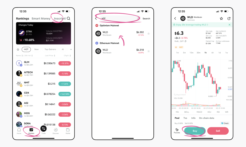 - Чтобы купить WLD, нажмите «Рынки» и выполните поиск «WLD». Выберите «Купить», чтобы получить доступ к Bitget Swap и начать торговать!