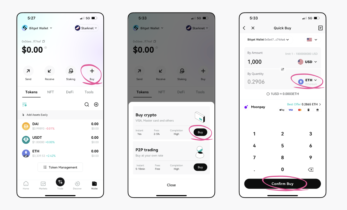 4. Вы успешно создали кошелек Web3 для Starknet! Теперь вы можете добавить ETH и другие токены Starknet в свой кошелек через «Управление токенами». Как купить токен Starknet (STRK)? Прежде чем покупать Starknet (STRK), необходимо сначала хранить криптовалюты, такие как ETH, в основной сети Ethereum. Если у вас нет этих активов, Bitget Wallet предлагает внебиржевую услугу (OTC), где вы можете приобрести криптовалюту за бумажные валюты. Сервис принимает различные способы оплаты, включая Visa, Mastercard, Apple Pay, Google Pay и кредитные карты в долларах США. 1. Откройте свой кошелек Bitget и перейдите на страницу «Кошелек». Здесь выберите опцию «Купить». 2. Выберите фиатную валюту, которую вы хотите использовать, а затем выберите «ETH» (в Ethereum) в раскрывающемся меню. 3. Введите сумму, которую хотите купить, подтвердите покупку и выберите способ оплаты. 4. Как только транзакция будет завершена, купленный ETH появится на главной странице вашего кошелька Bitget. 5. Чтобы купить STRK (на Ethereum), нажмите «Рынки» и найдите «STRK». Выберите «Купить», чтобы получить доступ к Bitget Swap и начать торговать! Как отправить Starknet (STRK) на другой кошелек? Чтобы внести STRK в свой кошелек STRK из других криптокошельков или бирж, просто: 1. Перейдите на домашнюю страницу Bitget Wallet и выберите «Получить». 2. Выберите сеть Ethereum и найдите STRK. 3. Скопируйте адрес своего кошелька STRK или используйте QR-код для упрощения перевода. 4. На выбранной вами бирже или кошельке начните процесс вывода или перевода и вставьте адрес своего кошелька STRK для внесения средств. Помните, что перед завершением процесса внесения депозита крайне важно дважды проверить адрес и подтвердить совместимость сети. Как вывести Starknet (STRK) с моего кошелька? Чтобы вывести STRK из вашего кошелька STRK на другие криптокошельки или биржи, просто: 1. Перейдите на домашнюю страницу Bitget Wallet и выберите «Отправить». 2. Выберите сеть Etherum и найдите STRK. 3. Введите адрес получателя и сумму и подтвердите транзакцию. Помните, что перед завершением процесса передачи крайне важно дважды проверить адрес и убедиться в совместимости сети.