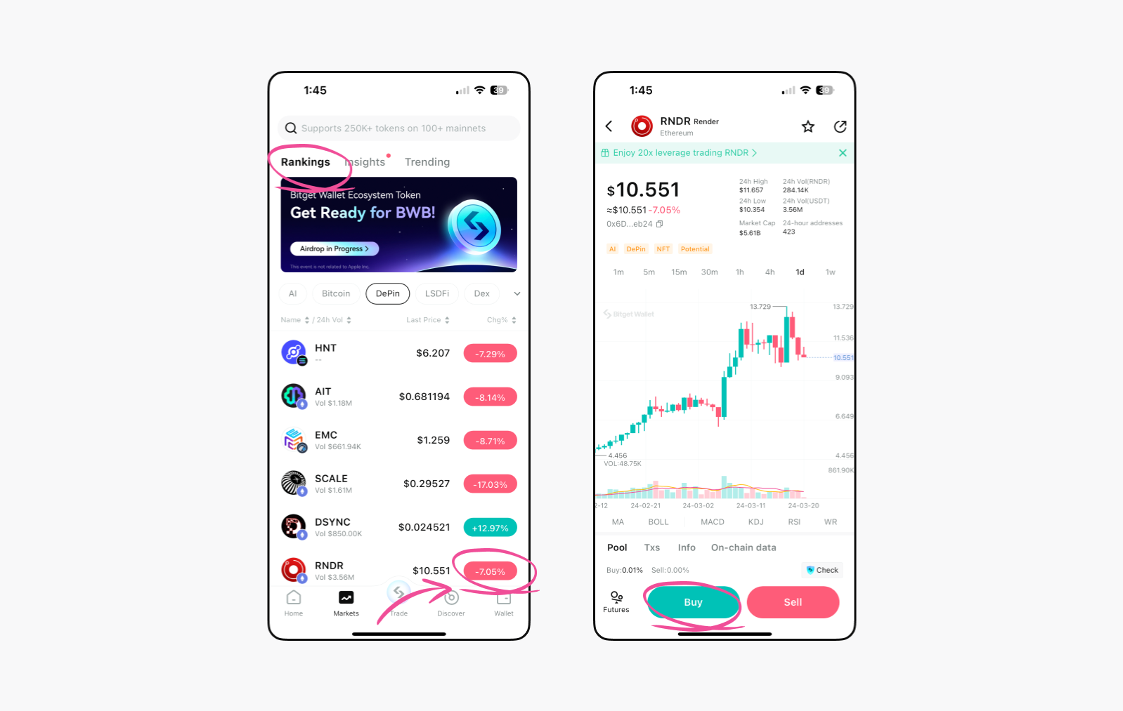 - Информация о рынке: отслеживайте цены и тенденции токенов DePin.