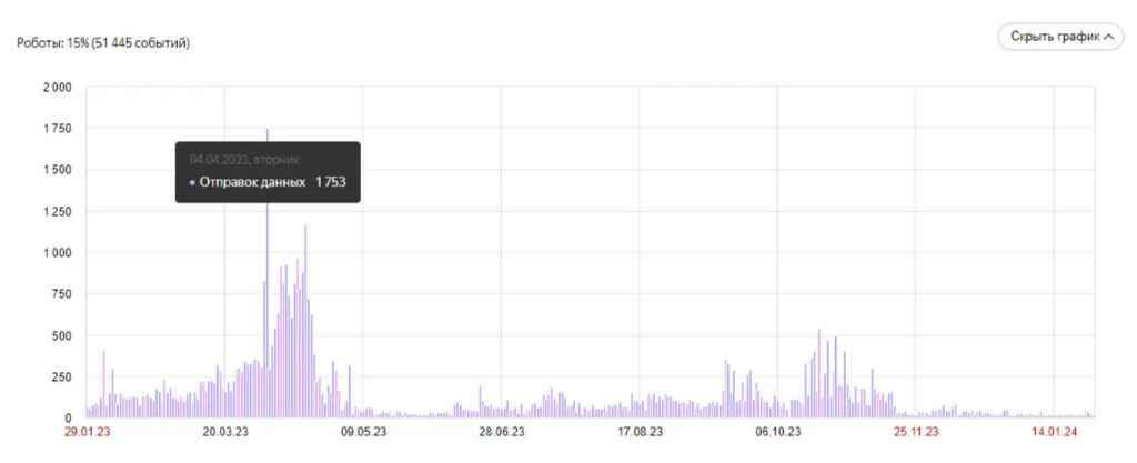 Как вы можете заметить, то с 29.01.23 Боты постепенно начали проявлять активность, и уже 04.04.23 эта активность достигла пикового значения в 1753 запроса с интервалом 12 запросов в секунду.