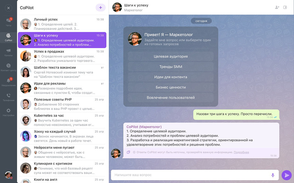 - Чат при звонке сохраняется, возможно продолжение обсуждения.