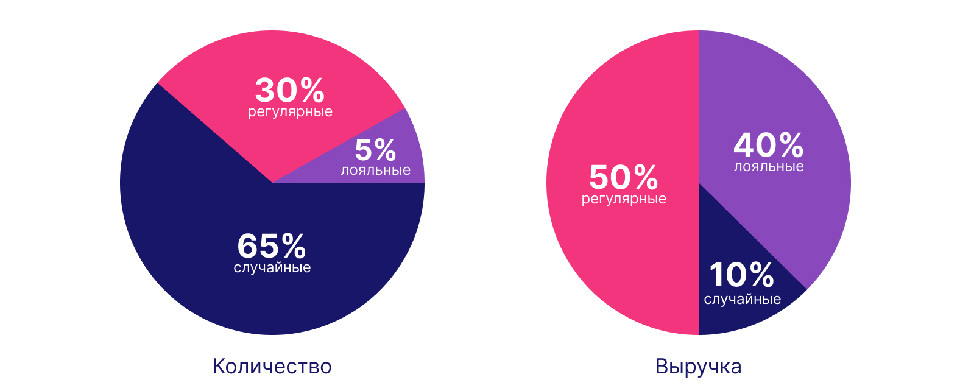 - Постоянные — клиенты, у которых установился постоянный цикл взаимодействия с компанией. Можно уделять особое внимание через персонализированные предложения, специальные подарки и индивидуальное обслуживание, чтобы укреплять долгосрочные отношения.