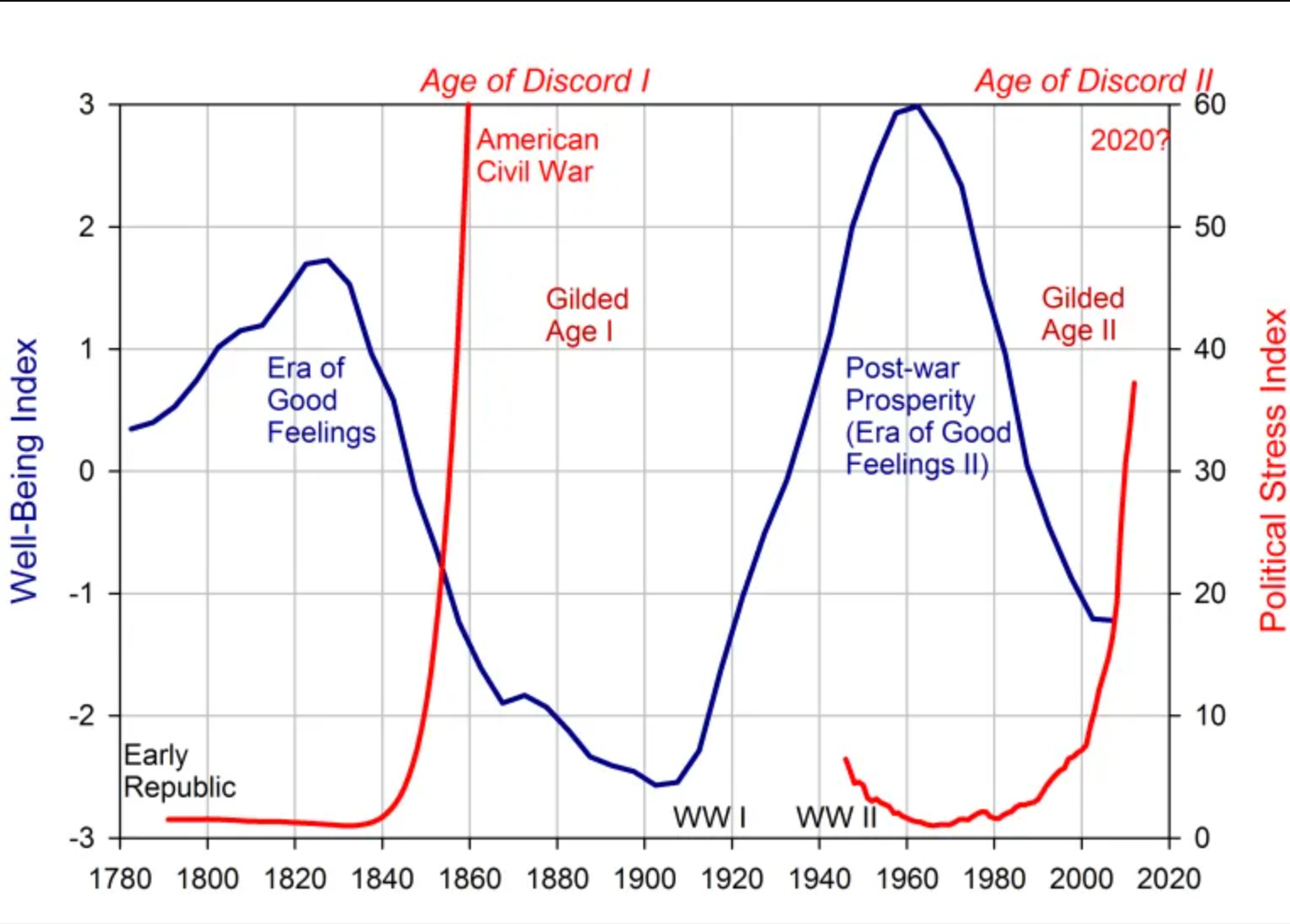 Америка сейчас идет по пути дезинтеграции. Ее интегративная фаза закончилась примерно в 1980-е, когда общественный договор между средним американцем (белым гетеросексуальным мужчиной-протестантом англо-саксонского происхождения) был нарушен со стороны элиты, которая включила «насос богатства». Налоги для сверхбогатых были снижены, а Америка стала жить по принципу «жадность — это хорошо». Одним из самых заметных биологических факторов, которые свидетельствуют о наступлении кризиса, является уменьшение средней продолжительности жизни и роста американцев. С 2014 года ожидаемая продолжительность жизни в США уменьшилась на 1,6 года и продолжает снижаться, а средний рост уменьшается с 1980-х годов. Любая интеграционная фаза характеризуется наличием общественного договора, который состоит из некоторых компромиссов. После Великой депрессии американские финансовые элиты заключили негласный договор между государством и рабочим классом, согласившись увеличивать минимальную среднюю зарплату с темпами, опережающими инфляцию. Американским рабочим просто не было нужды устраивать социальную революцию, когда их благосостояние росло, они могли вести коллективные переговоры и ставить условия начальству через профсоюзы, строить относительно недорогие дома для своей семьи и даже покупать автомобили. Рост благосостояния продолжался примерно до 1970-х годов. После этого относительная зарплата рабочих начала снижаться. Крупные корпорации выводили бизнес в страны с более дешевой рабочей силой, сеяли раздор внутри рабочего движения (в том числе через расовый вопрос), требовали подписывать невыгодные для работника трудовые договоры. Любая элита всегда будет пытаться извлечь максимальную выгоду для себя за счет интересов других групп — просто потому что может. США в первой половине XX века оказались перед экзистенциальной угрозой внутренних бунтов из-за безработицы и внешних — из-за распространения идеологий фашизма и коммунизма. Это стало тем отрезвляющим фактором, который побудил элиты согласиться на высокое налоговое бремя для сохранения американского образа жизни и капиталистической экономической модели. Одной из причин начала дезинтегративных фаз Турчин считает процесс перепроизводства элит. Элиты существуют в любом обществе. Они не обязательно должны обладать каким-то формальным статусом в системе государственной власти, хотя многие к этому, конечно, стремятся. С точки зрения исследователя, элитой нужно считать тех, кто обладает большой социальной властью и влиянием на людей — административным, экономическим или идеологическим. Поэтому к элите в США можно отнести чиновников, сенаторов и конгрессменов, высокопоставленных военных, руководителей корпораций, телеведущих и блогеров с большой аудиторией, а также богачей, чье состояние составляет от 1 миллиона долларов и выше (т.н. «десятипроцентники», то есть люди, составляющие 10% самых богатых людей страны). В момент начала интегративной фазы элиты и «простолюдины» находятся в балансе, поскольку часто прошлая элита была уничтожена (или сильно поредела) в момент предыдущего кризиса. Это значит, что социальные лифты многим дают возможность подняться наверх и занять свое место, стать частью элиты. Со временем элита разрастается, и мест для всех начинает нехватать. Те, кто стре