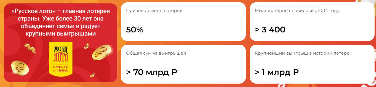 Русское лото — народная классика и одновременно самые выигрышные лотереи в России по количеству квартир и авто. Билет стоит копейки, зато главный приз доходит до млрд; идеально, если хочется выиграть деньги онлайн и смотреть розыгрыш по ТВ.