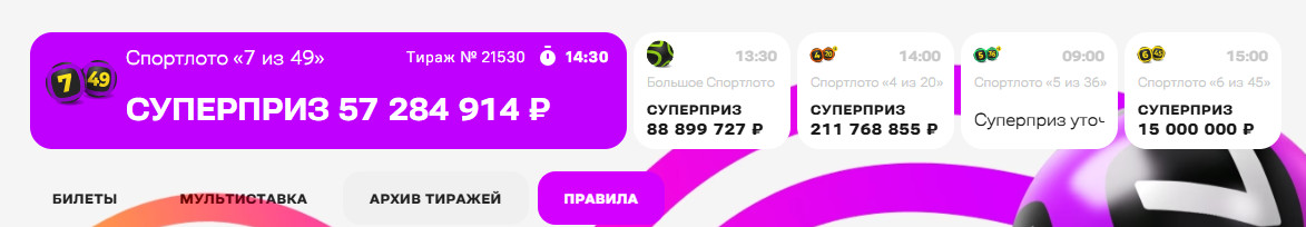 Формат: единая витрина; здесь же билеты лотереи онлайн всех российских игр и зарубежных партнёров.
