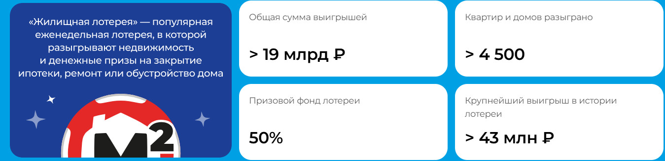 Жилищная лотерея — билет к собственным метрам: еженедельно квартиры, дачи и участки + миллиардный суперприз в спецтиражах. Занимает верхние строчки всех списков, где можно выиграть деньги на недвижимость.