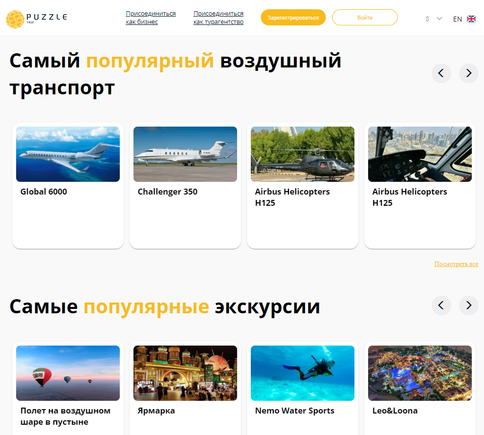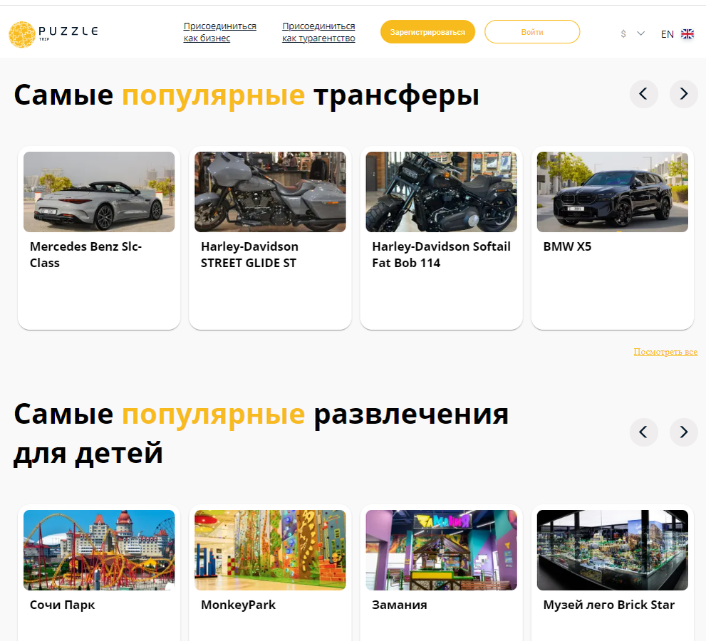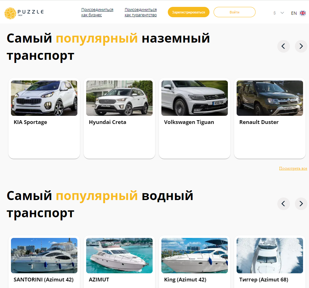 Puzzle Trip — международный мультисервисный инновационный онлайн-агрегатор, который предлагает широкий спектр услуг в сфере туризма. Одной из ключевых услуг, предоставляемых агрегатором, является аренда транспорта.Аренда транспорта с помощью Puzzle Trip стала проще, удобнее и более выгодной. Пользователи агрегатора могут легко выбрать и забронировать транспортное средство, подходящее именно для их путешествия. В ассортименте Puzzle Trip представлены различные виды транспорта, включая автомобили, мотоциклы, велосипеды, квадроциклы и другие.