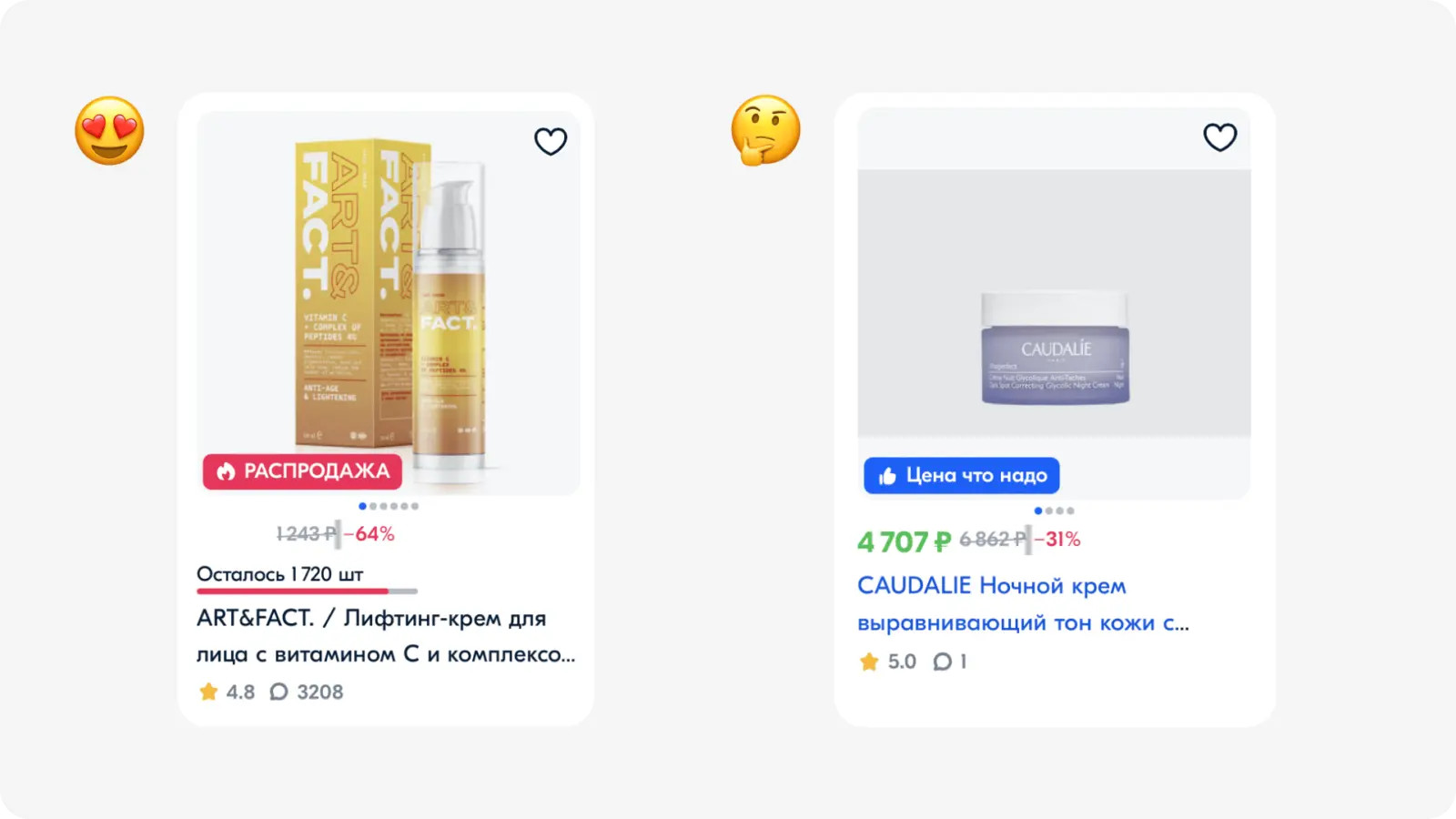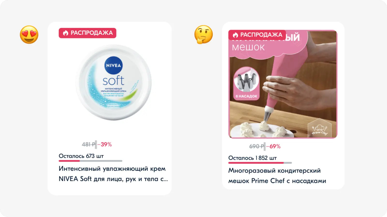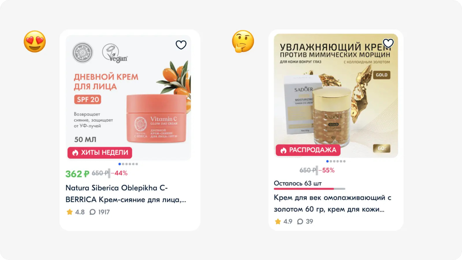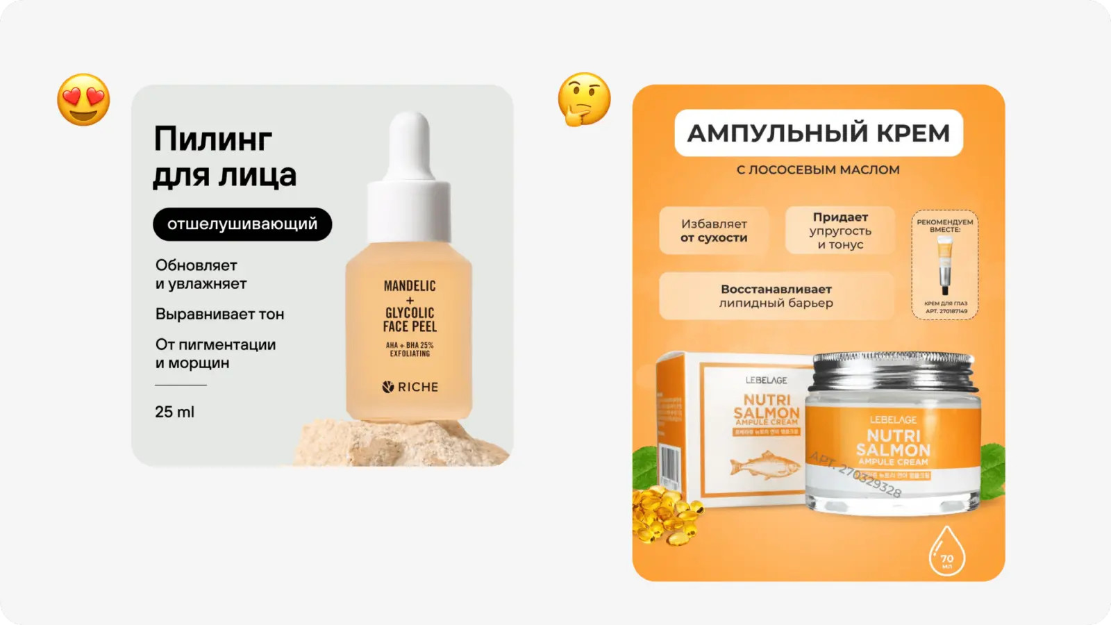 «Конкуренция растёт ивыделяться всё сложнее. Но главное транслировать ценности вашего бренда для покупателей. Старайтесь отстроиться не с помощью инфографики или красивых видео, а в первую очередь, за счёт функционала товара и подробно объяснять, зачем он нужен, как его правильно использовать. Показывать функционал — крайне важно, при этом нужно накладывать вкусную картинку», — делится своим опытом Антон Тимонин, руководитель направления e-com компании FORSAL. «Если будет стоять абсолютно серый фон, и товар никак не подсвечен, то, к сожалению, никак он не сможет заинтересовать. Сейчас идёт тренд на анимации, на видео, на показ товара в действии. Если это условный гель для стирки, можно показать, как он красиво льётся, какой он тягучий, его цвет и „вкусность“ передать покупателю через картинку, а далее подкрепить его всеми необходимыми свойствами для того, чтобы пользователь не только купил у вас товар, но и впоследствии возвращался к нему снова и снова». Остановимся на изображениях, которые пользователь видит внутри карточки товара. Именно визуал в первую очередь «цепляет» пользователя. В этот момент пользователь принимает решение: это подходит мне или нет. 1. Добавьте фотографии в разных ракурсах. Главная особенность любого маркетплейса — пользователь не может потрогать товар руками. Но выбрать ему нужно, поэтому стоит задача всё подробно показать, с разных сторон, чтобы у человека сложилась полная картинка. Оптимальное количество фотографий для вашего товара можно определить, подсматривая за конкурентами в этой же категории. Ozon утверждает, что карточки с большим количеством контента попадают в корзину на 29% чаще. Поэтому позаботьтесь о том, чтобы у вас было, что показать и сказать пользователю. 2. Товар должен занимать 2/3 фотографии. Это общее правило, которое не дает уйти в одну из крайностей: «кричать товаром» или показать практически пустую картинку. Когда товар занимает 2/3 фотографии, покупателю видно некоторые детали упаковки. Представьте, как фотография товара справа будет выглядеть на экране смартфона. Упаковка практически растворилась с фоном картинки. «Холодный» покупатель с большой вероятностью предпочтет товар слева 3. Добавьте инфографику на фотографии с товаром. Инфографикой называют надписи, цифры, иконки и прочие визуальные элементы, которые рассказывают о преимуществах товара. Инфографика выгодно подчеркивает отличия от дешевых аналогов. С её помощью вы можете сделать акцент на функциях, преимуществах или какой-то важной характеристике товара. Но не перегружайте макет обилием информации, это только затруднит чтение и может оттолкнуть пользователя. «На этих площадках часто перенасыщенные рекламные макеты. Это то, почему я не люблю маркетплейсы. Для меня все площадки выглядят как оцифрованные каталоги орифлейм из нулевых. Очень много шума и визуального перегруза. Главный принцип, как и везде в рекламе — дизайн не должен перебивать товар», — Мару, дизайнер Brand Hub. Слева «чистый» дизайн, упорядоченная информация. Картинка справа на фоне соседа будто кричит текстом и обилием визуальных деталей Основные рекомендации для инфографики, которые дают маркетплейсы: На примере справа не учли правило «свободных углов». Поэтому получился такой «нахлест» интерфейса на изображение «У маркетплейсов есть прозрачная 